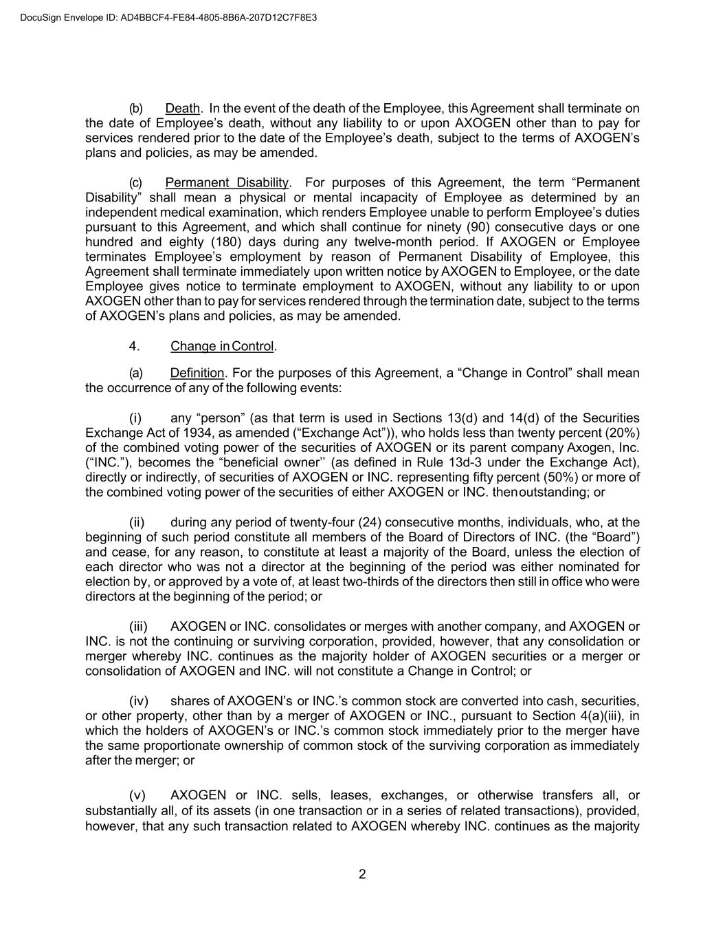 2 (b) Death. In the event of the death of the Employee, this Agreement shall terminate on the date of Employee’s death, without any liability to or upon AXOGEN other than to pay for services rendered prior to the date of the Employee’s death, subject to the terms of AXOGEN’s plans and policies, as may be amended. (c) Permanent Disability. For purposes of this Agreement, the term “Permanent Disability” shall mean a physical or mental incapacity of Employee as determined by an independent medical examination, which renders Employee unable to perform Employee’s duties pursuant to this Agreement, and which shall continue for ninety (90) consecutive days or one hundred and eighty (180) days during any twelve-month period. If AXOGEN or Employee terminates Employee’s employment by reason of Permanent Disability of Employee, this Agreement shall terminate immediately upon written notice by AXOGEN to Employee, or the date Employee gives notice to terminate employment to AXOGEN, without any liability to or upon AXOGEN other than to pay for services rendered through the termination date, subject to the terms of AXOGEN’s plans and policies, as may be amended. 4. Change in Control. (a) Definition. For the purposes of this Agreement, a “Change in Control” shall mean the occurrence of any of the following events: (i) any “person” (as that term is used in Sections 13(d) and 14(d) of the Securities Exchange Act of 1934, as amended (“Exchange Act”)), who holds less than twenty percent (20%) of the combined voting power of the securities of AXOGEN or its parent company Axogen, Inc. (“INC.”), becomes the “beneficial owner’’ (as defined in Rule 13d-3 under the Exchange Act), directly or indirectly, of securities of AXOGEN or INC. representing fifty percent (50%) or more of the combined voting power of the securities of either AXOGEN or INC. then outstanding; or (ii) during any period of twenty-four (24) consecutive months, individuals, who, at the beginning of such period constitute all members of the Board of Directors of INC. (the “Board”) and cease, for any reason, to constitute at least a majority of the Board, unless the election of each director who was not a director at the beginning of the period was either nominated for election by, or approved by a vote of, at least two-thirds of the directors then still in office who were directors at the beginning of the period; or (iii) AXOGEN or INC. consolidates or merges with another company, and AXOGEN or INC. is not the continuing or surviving corporation, provided, however, that any consolidation or merger whereby INC. continues as the majority holder of AXOGEN securities or a merger or consolidation of AXOGEN and INC. will not constitute a Change in Control; or (iv) shares of AXOGEN’s or INC.’s common stock are converted into cash, securities, or other property, other than by a merger of AXOGEN or INC., pursuant to Section 4(a)(iii), in which the holders of AXOGEN’s or INC.’s common stock immediately prior to the merger have the same proportionate ownership of common stock of the surviving corporation as immediately after the merger; or (v) AXOGEN or INC. sells, leases, exchanges, or otherwise transfers all, or substantially all, of its assets (in one transaction or in a series of related transactions), provided, however, that any such transaction related to AXOGEN whereby INC. continues as the majority DocuSign Envelope ID: AD4BBCF4-FE84-4805-8B6A-207D12C7F8E3