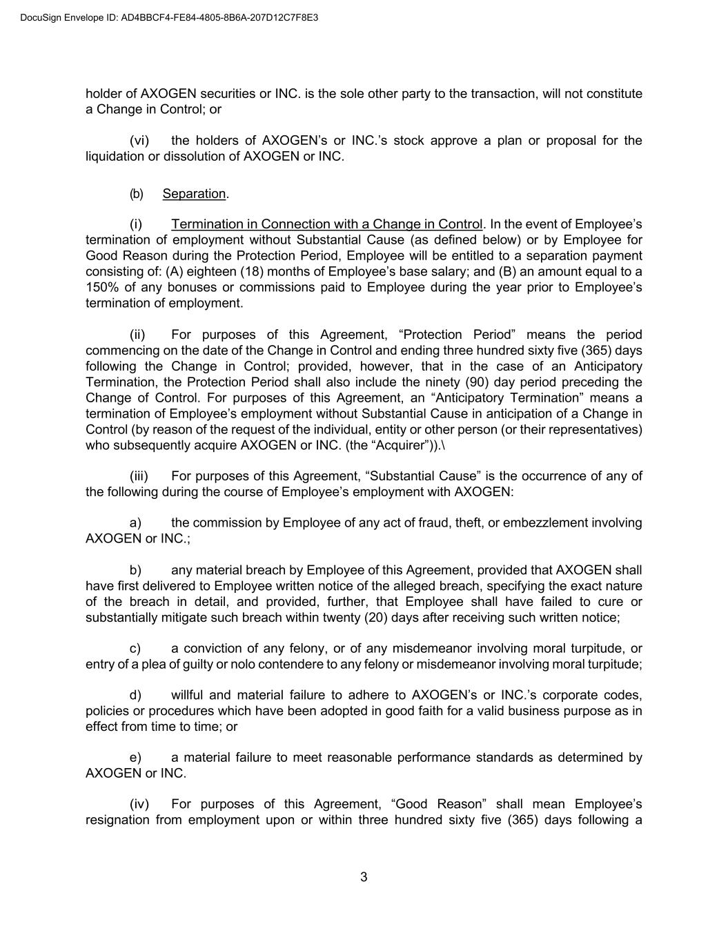 3 holder of AXOGEN securities or INC. is the sole other party to the transaction, will not constitute a Change in Control; or (vi) the holders of AXOGEN’s or INC.’s stock approve a plan or proposal for the liquidation or dissolution of AXOGEN or INC. (b) Separation. (i) Termination in Connection with a Change in Control. In the event of Employee’s termination of employment without Substantial Cause (as defined below) or by Employee for Good Reason during the Protection Period, Employee will be entitled to a separation payment consisting of: (A) eighteen (18) months of Employee’s base salary; and (B) an amount equal to a 150% of any bonuses or commissions paid to Employee during the year prior to Employee’s termination of employment. (ii) For purposes of this Agreement, “Protection Period” means the period commencing on the date of the Change in Control and ending three hundred sixty five (365) days following the Change in Control; provided, however, that in the case of an Anticipatory Termination, the Protection Period shall also include the ninety (90) day period preceding the Change of Control. For purposes of this Agreement, an “Anticipatory Termination” means a termination of Employee’s employment without Substantial Cause in anticipation of a Change in Control (by reason of the request of the individual, entity or other person (or their representatives) who subsequently acquire AXOGEN or INC. (the “Acquirer”)).\ (iii) For purposes of this Agreement, “Substantial Cause” is the occurrence of any of the following during the course of Employee’s employment with AXOGEN: a) the commission by Employee of any act of fraud, theft, or embezzlement involving AXOGEN or INC.; b) any material breach by Employee of this Agreement, provided that AXOGEN shall have first delivered to Employee written notice of the alleged breach, specifying the exact nature of the breach in detail, and provided, further, that Employee shall have failed to cure or substantially mitigate such breach within twenty (20) days after receiving such written notice; c) a conviction of any felony, or of any misdemeanor involving moral turpitude, or entry of a plea of guilty or nolo contendere to any felony or misdemeanor involving moral turpitude; d) willful and material failure to adhere to AXOGEN’s or INC.’s corporate codes, policies or procedures which have been adopted in good faith for a valid business purpose as in effect from time to time; or e) a material failure to meet reasonable performance standards as determined by AXOGEN or INC. (iv) For purposes of this Agreement, “Good Reason” shall mean Employee’s resignation from employment upon or within three hundred sixty five (365) days following a DocuSign Envelope ID: AD4BBCF4-FE84-4805-8B6A-207D12C7F8E3