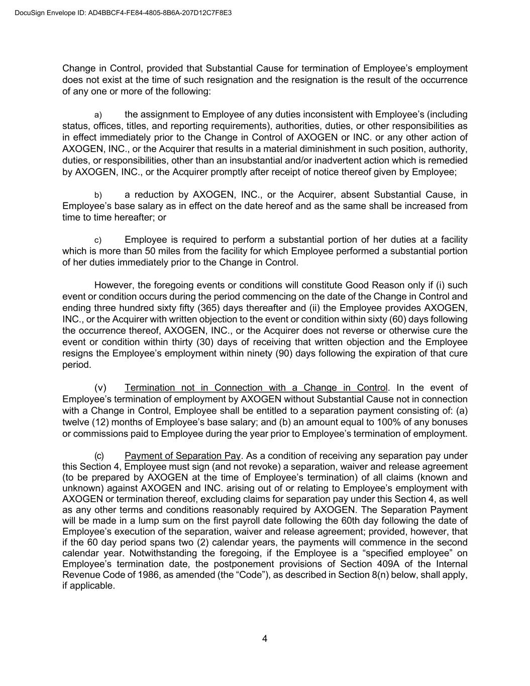 4 Change in Control, provided that Substantial Cause for termination of Employee’s employment does not exist at the time of such resignation and the resignation is the result of the occurrence of any one or more of the following: a) the assignment to Employee of any duties inconsistent with Employee’s (including status, offices, titles, and reporting requirements), authorities, duties, or other responsibilities as in effect immediately prior to the Change in Control of AXOGEN or INC. or any other action of AXOGEN, INC., or the Acquirer that results in a material diminishment in such position, authority, duties, or responsibilities, other than an insubstantial and/or inadvertent action which is remedied by AXOGEN, INC., or the Acquirer promptly after receipt of notice thereof given by Employee; b) a reduction by AXOGEN, INC., or the Acquirer, absent Substantial Cause, in Employee’s base salary as in effect on the date hereof and as the same shall be increased from time to time hereafter; or c) Employee is required to perform a substantial portion of her duties at a facility which is more than 50 miles from the facility for which Employee performed a substantial portion of her duties immediately prior to the Change in Control. However, the foregoing events or conditions will constitute Good Reason only if (i) such event or condition occurs during the period commencing on the date of the Change in Control and ending three hundred sixty fifty (365) days thereafter and (ii) the Employee provides AXOGEN, INC., or the Acquirer with written objection to the event or condition within sixty (60) days following the occurrence thereof, AXOGEN, INC., or the Acquirer does not reverse or otherwise cure the event or condition within thirty (30) days of receiving that written objection and the Employee resigns the Employee’s employment within ninety (90) days following the expiration of that cure period. (v) Termination not in Connection with a Change in Control. In the event of Employee’s termination of employment by AXOGEN without Substantial Cause not in connection with a Change in Control, Employee shall be entitled to a separation payment consisting of: (a) twelve (12) months of Employee’s base salary; and (b) an amount equal to 100% of any bonuses or commissions paid to Employee during the year prior to Employee’s termination of employment. (c) Payment of Separation Pay. As a condition of receiving any separation pay under this Section 4, Employee must sign (and not revoke) a separation, waiver and release agreement (to be prepared by AXOGEN at the time of Employee’s termination) of all claims (known and unknown) against AXOGEN and INC. arising out of or relating to Employee’s employment with AXOGEN or termination thereof, excluding claims for separation pay under this Section 4, as well as any other terms and conditions reasonably required by AXOGEN. The Separation Payment will be made in a lump sum on the first payroll date following the 60th day following the date of Employee’s execution of the separation, waiver and release agreement; provided, however, that if the 60 day period spans two (2) calendar years, the payments will commence in the second calendar year. Notwithstanding the foregoing, if the Employee is a “specified employee” on Employee’s termination date, the postponement provisions of Section 409A of the Internal Revenue Code of 1986, as amended (the “Code”), as described in Section 8(n) below, shall apply, if applicable. DocuSign Envelope ID: AD4BBCF4-FE84-4805-8B6A-207D12C7F8E3