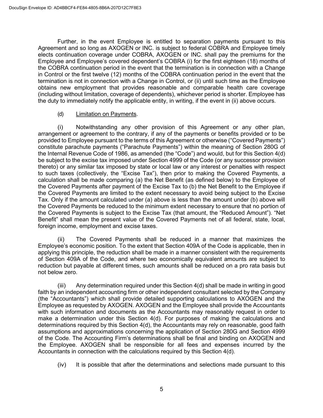 5 Further, in the event Employee is entitled to separation payments pursuant to this Agreement and so long as AXOGEN or INC. is subject to federal COBRA and Employee timely elects continuation coverage under COBRA, AXOGEN or INC. shall pay the premiums for the Employee and Employee’s covered dependent’s COBRA (i) for the first eighteen (18) months of the COBRA continuation period in the event that the termination is in connection with a Change in Control or the first twelve (12) months of the COBRA continuation period in the event that the termination is not in connection with a Change in Control, or (ii) until such time as the Employee obtains new employment that provides reasonable and comparable health care coverage (including without limitation, coverage of dependents), whichever period is shorter. Employee has the duty to immediately notify the applicable entity, in writing, if the event in (ii) above occurs. (d) Limitation on Payments. (i) Notwithstanding any other provision of this Agreement or any other plan, arrangement or agreement to the contrary, if any of the payments or benefits provided or to be provided to Employee pursuant to the terms of this Agreement or otherwise (“Covered Payments”) constitute parachute payments (“Parachute Payments”) within the meaning of Section 280G of the Internal Revenue Code of 1986, as amended (the “Code”) and would, but for this Section 4(d) be subject to the excise tax imposed under Section 4999 of the Code (or any successor provision thereto) or any similar tax imposed by state or local law or any interest or penalties with respect to such taxes (collectively, the “Excise Tax”), then prior to making the Covered Payments, a calculation shall be made comparing (a) the Net Benefit (as defined below) to the Employee of the Covered Payments after payment of the Excise Tax to (b) the Net Benefit to the Employee if the Covered Payments are limited to the extent necessary to avoid being subject to the Excise Tax. Only if the amount calculated under (a) above is less than the amount under (b) above will the Covered Payments be reduced to the minimum extent necessary to ensure that no portion of the Covered Payments is subject to the Excise Tax (that amount, the “Reduced Amount”). “Net Benefit” shall mean the present value of the Covered Payments net of all federal, state, local, foreign income, employment and excise taxes. (ii) The Covered Payments shall be reduced in a manner that maximizes the Employee’s economic position. To the extent that Section 409A of the Code is applicable, then in applying this principle, the reduction shall be made in a manner consistent with the requirements of Section 409A of the Code, and where two economically equivalent amounts are subject to reduction but payable at different times, such amounts shall be reduced on a pro rata basis but not below zero. (iii) Any determination required under this Section 4(d) shall be made in writing in good faith by an independent accounting firm or other independent consultant selected by the Company (the “Accountants”) which shall provide detailed supporting calculations to AXOGEN and the Employee as requested by AXOGEN. AXOGEN and the Employee shall provide the Accountants with such information and documents as the Accountants may reasonably request in order to make a determination under this Section 4(d). For purposes of making the calculations and determinations required by this Section 4(d), the Accountants may rely on reasonable, good faith assumptions and approximations concerning the application of Section 280G and Section 4999 of the Code. The Accounting Firm’s determinations shall be final and binding on AXOGEN and the Employee. AXOGEN shall be responsible for all fees and expenses incurred by the Accountants in connection with the calculations required by this Section 4(d). (iv) It is possible that after the determinations and selections made pursuant to this DocuSign Envelope ID: AD4BBCF4-FE84-4805-8B6A-207D12C7F8E3