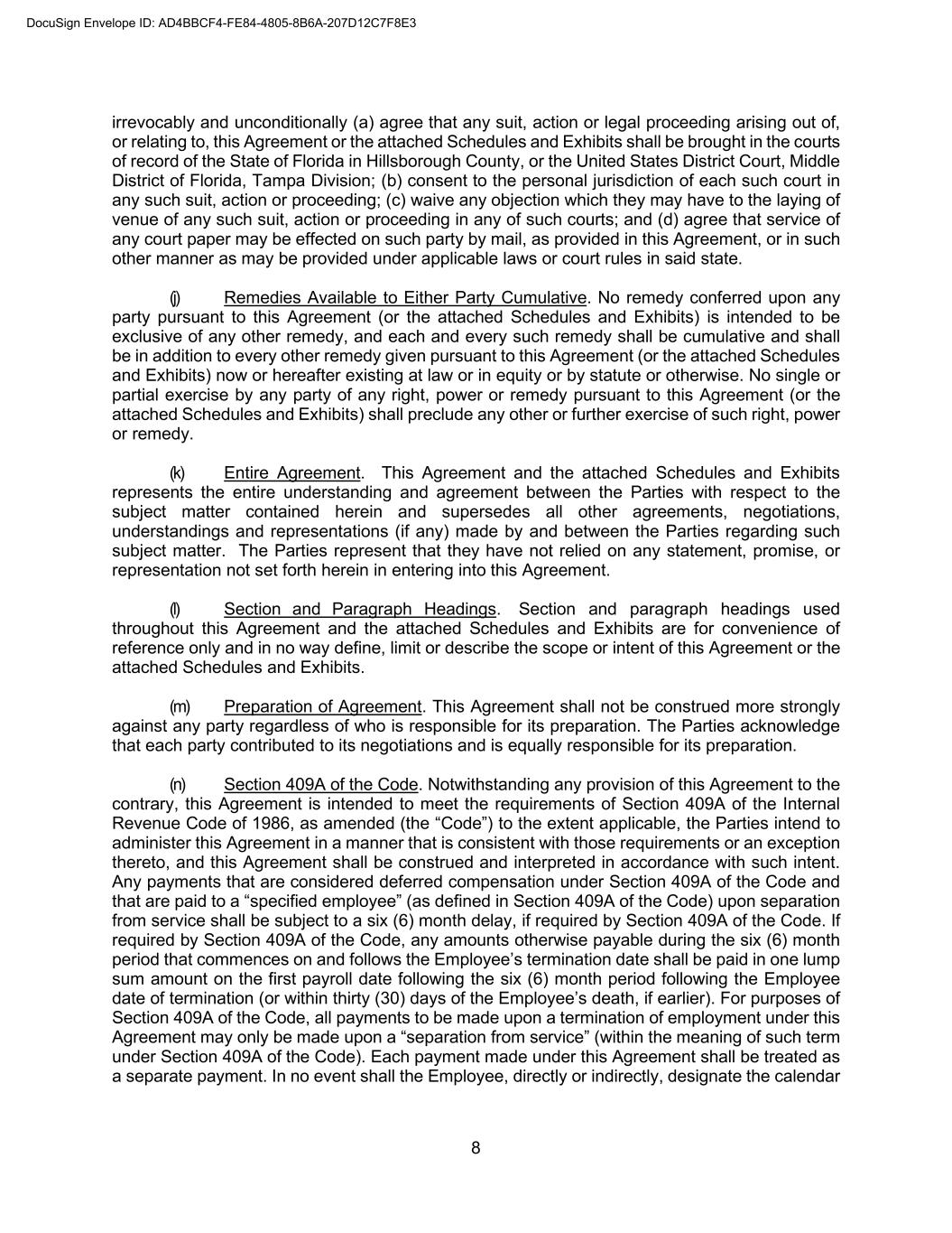 8 irrevocably and unconditionally (a) agree that any suit, action or legal proceeding arising out of, or relating to, this Agreement or the attached Schedules and Exhibits shall be brought in the courts of record of the State of Florida in Hillsborough County, or the United States District Court, Middle District of Florida, Tampa Division; (b) consent to the personal jurisdiction of each such court in any such suit, action or proceeding; (c) waive any objection which they may have to the laying of venue of any such suit, action or proceeding in any of such courts; and (d) agree that service of any court paper may be effected on such party by mail, as provided in this Agreement, or in such other manner as may be provided under applicable laws or court rules in said state. (j) Remedies Available to Either Party Cumulative. No remedy conferred upon any party pursuant to this Agreement (or the attached Schedules and Exhibits) is intended to be exclusive of any other remedy, and each and every such remedy shall be cumulative and shall be in addition to every other remedy given pursuant to this Agreement (or the attached Schedules and Exhibits) now or hereafter existing at law or in equity or by statute or otherwise. No single or partial exercise by any party of any right, power or remedy pursuant to this Agreement (or the attached Schedules and Exhibits) shall preclude any other or further exercise of such right, power or remedy. (k) Entire Agreement. This Agreement and the attached Schedules and Exhibits represents the entire understanding and agreement between the Parties with respect to the subject matter contained herein and supersedes all other agreements, negotiations, understandings and representations (if any) made by and between the Parties regarding such subject matter. The Parties represent that they have not relied on any statement, promise, or representation not set forth herein in entering into this Agreement. (l) Section and Paragraph Headings. Section and paragraph headings used throughout this Agreement and the attached Schedules and Exhibits are for convenience of reference only and in no way define, limit or describe the scope or intent of this Agreement or the attached Schedules and Exhibits. (m) Preparation of Agreement. This Agreement shall not be construed more strongly against any party regardless of who is responsible for its preparation. The Parties acknowledge that each party contributed to its negotiations and is equally responsible for its preparation. (n) Section 409A of the Code. Notwithstanding any provision of this Agreement to the contrary, this Agreement is intended to meet the requirements of Section 409A of the Internal Revenue Code of 1986, as amended (the “Code”) to the extent applicable, the Parties intend to administer this Agreement in a manner that is consistent with those requirements or an exception thereto, and this Agreement shall be construed and interpreted in accordance with such intent. Any payments that are considered deferred compensation under Section 409A of the Code and that are paid to a “specified employee” (as defined in Section 409A of the Code) upon separation from service shall be subject to a six (6) month delay, if required by Section 409A of the Code. If required by Section 409A of the Code, any amounts otherwise payable during the six (6) month period that commences on and follows the Employee’s termination date shall be paid in one lump sum amount on the first payroll date following the six (6) month period following the Employee date of termination (or within thirty (30) days of the Employee’s death, if earlier). For purposes of Section 409A of the Code, all payments to be made upon a termination of employment under this Agreement may only be made upon a “separation from service” (within the meaning of such term under Section 409A of the Code). Each payment made under this Agreement shall be treated as a separate payment. In no event shall the Employee, directly or indirectly, designate the calendar DocuSign Envelope ID: AD4BBCF4-FE84-4805-8B6A-207D12C7F8E3