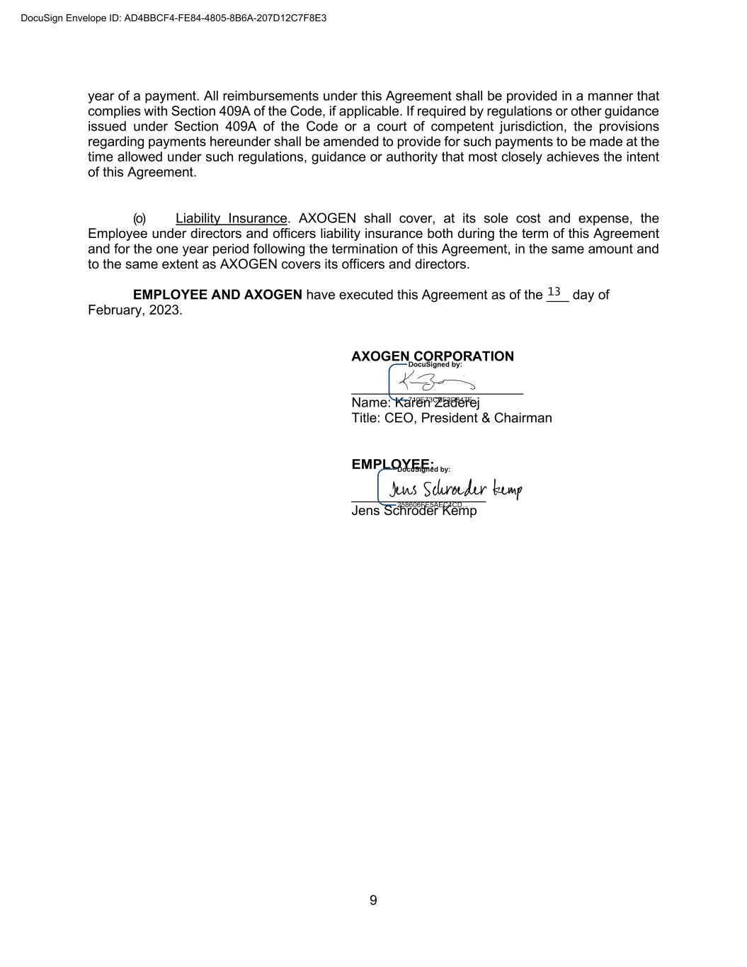 9 year of a payment. All reimbursements under this Agreement shall be provided in a manner that complies with Section 409A of the Code, if applicable. If required by regulations or other guidance issued under Section 409A of the Code or a court of competent jurisdiction, the provisions regarding payments hereunder shall be amended to provide for such payments to be made at the time allowed under such regulations, guidance or authority that most closely achieves the intent of this Agreement. (o) Liability Insurance. AXOGEN shall cover, at its sole cost and expense, the Employee under directors and officers liability insurance both during the term of this Agreement and for the one year period following the termination of this Agreement, in the same amount and to the same extent as AXOGEN covers its officers and directors. EMPLOYEE AND AXOGEN have executed this Agreement as of the ___ day of February, 2023. AXOGEN CORPORATION _______________________ Name: Karen Zaderej Title: CEO, President & Chairman EMPLOYEE: __________________ Jens Schroder Kemp DocuSign Envelope ID: AD4BBCF4-FE84-4805-8B6A-207D12C7F8E3 13