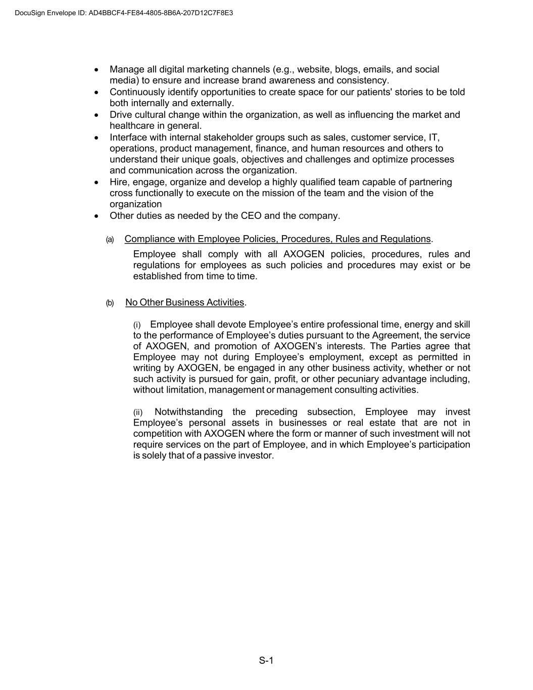 S-1 • Manage all digital marketing channels (e.g., website, blogs, emails, and social media) to ensure and increase brand awareness and consistency. • Continuously identify opportunities to create space for our patients' stories to be told both internally and externally. • Drive cultural change within the organization, as well as influencing the market and healthcare in general. • Interface with internal stakeholder groups such as sales, customer service, IT, operations, product management, finance, and human resources and others to understand their unique goals, objectives and challenges and optimize processes and communication across the organization. • Hire, engage, organize and develop a highly qualified team capable of partnering cross functionally to execute on the mission of the team and the vision of the organization • Other duties as needed by the CEO and the company. (a) Compliance with Employee Policies, Procedures, Rules and Regulations. Employee shall comply with all AXOGEN policies, procedures, rules and regulations for employees as such policies and procedures may exist or be established from time to time. (b) No Other Business Activities. (i) Employee shall devote Employee’s entire professional time, energy and skill to the performance of Employee’s duties pursuant to the Agreement, the service of AXOGEN, and promotion of AXOGEN’s interests. The Parties agree that Employee may not during Employee’s employment, except as permitted in writing by AXOGEN, be engaged in any other business activity, whether or not such activity is pursued for gain, profit, or other pecuniary advantage including, without limitation, management or management consulting activities. (ii) Notwithstanding the preceding subsection, Employee may invest Employee’s personal assets in businesses or real estate that are not in competition with AXOGEN where the form or manner of such investment will not require services on the part of Employee, and in which Employee’s participation is solely that of a passive investor. DocuSign Envelope ID: AD4BBCF4-FE84-4805-8B6A-207D12C7F8E3