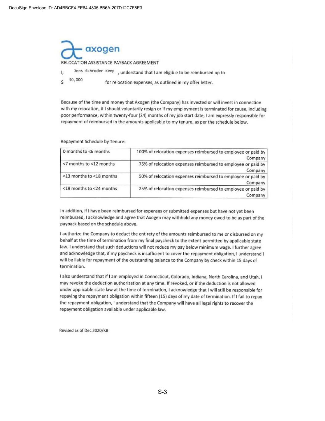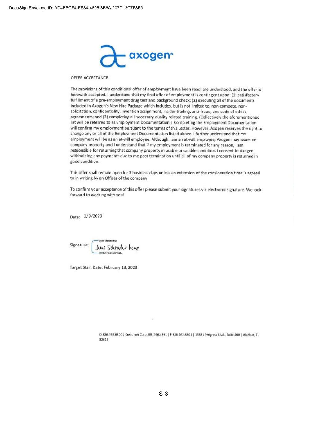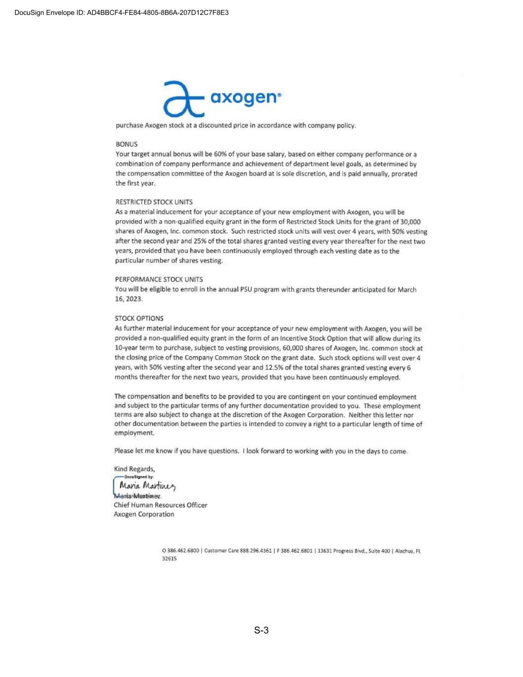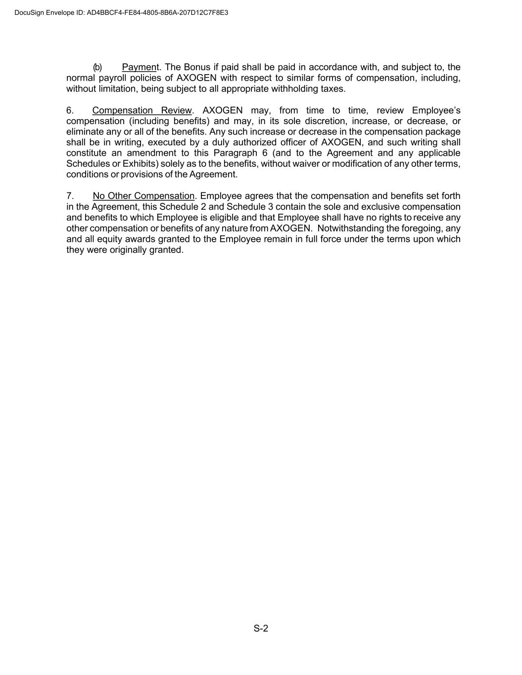 S-2 (b) Payment. The Bonus if paid shall be paid in accordance with, and subject to, the normal payroll policies of AXOGEN with respect to similar forms of compensation, including, without limitation, being subject to all appropriate withholding taxes. 6. Compensation Review. AXOGEN may, from time to time, review Employee’s compensation (including benefits) and may, in its sole discretion, increase, or decrease, or eliminate any or all of the benefits. Any such increase or decrease in the compensation package shall be in writing, executed by a duly authorized officer of AXOGEN, and such writing shall constitute an amendment to this Paragraph 6 (and to the Agreement and any applicable Schedules or Exhibits) solely as to the benefits, without waiver or modification of any other terms, conditions or provisions of the Agreement. 7. No Other Compensation. Employee agrees that the compensation and benefits set forth in the Agreement, this Schedule 2 and Schedule 3 contain the sole and exclusive compensation and benefits to which Employee is eligible and that Employee shall have no rights to receive any other compensation or benefits of any nature from AXOGEN. Notwithstanding the foregoing, any and all equity awards granted to the Employee remain in full force under the terms upon which they were originally granted. DocuSign Envelope ID: AD4BBCF4-FE84-4805-8B6A-207D12C7F8E3