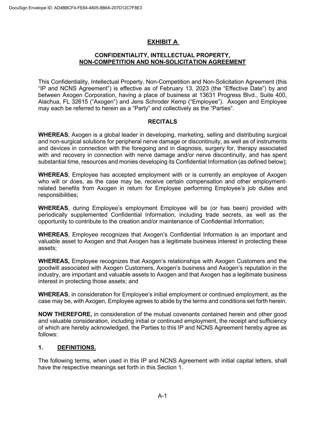 A-1 EXHIBIT A CONFIDENTIALITY, INTELLECTUAL PROPERTY, NON-COMPETITION AND NON-SOLICITATION AGREEMENT This Confidentiality, Intellectual Property, Non-Competition and Non-Solicitation Agreement (this “IP and NCNS Agreement”) is effective as of February 13, 2023 (the “Effective Date”) by and between Axogen Corporation, having a place of business at 13631 Progress Blvd., Suite 400, Alachua, FL 32615 (“Axogen”) and Jens Schroder Kemp (“Employee”). Axogen and Employee may each be referred to herein as a “Party” and collectively as the “Parties”. RECITALS WHEREAS, Axogen is a global leader in developing, marketing, selling and distributing surgical and non-surgical solutions for peripheral nerve damage or discontinuity, as well as of instruments and devices in connection with the foregoing and in diagnosis, surgery for, therapy associated with and recovery in connection with nerve damage and/or nerve discontinuity, and has spent substantial time, resources and monies developing its Confidential Information (as defined below); WHEREAS, Employee has accepted employment with or is currently an employee of Axogen who will or does, as the case may be, receive certain compensation and other employment- related benefits from Axogen in return for Employee performing Employee’s job duties and responsibilities; WHEREAS, during Employee’s employment Employee will be (or has been) provided with periodically supplemented Confidential Information, including trade secrets, as well as the opportunity to contribute to the creation and/or maintenance of Confidential Information; WHEREAS, Employee recognizes that Axogen’s Confidential Information is an important and valuable asset to Axogen and that Axogen has a legitimate business interest in protecting these assets; WHEREAS, Employee recognizes that Axogen’s relationships with Axogen Customers and the goodwill associated with Axogen Customers, Axogen’s business and Axogen’s reputation in the industry, are important and valuable assets to Axogen and that Axogen has a legitimate business interest in protecting those assets; and WHEREAS, in consideration for Employee’s initial employment or continued employment, as the case may be, with Axogen, Employee agrees to abide by the terms and conditions set forth herein. NOW THEREFORE, in consideration of the mutual covenants contained herein and other good and valuable consideration, including initial or continued employment, the receipt and sufficiency of which are hereby acknowledged, the Parties to this IP and NCNS Agreement hereby agree as follows: 1. DEFINITIONS. The following terms, when used in this IP and NCNS Agreement with initial capital letters, shall have the respective meanings set forth in this Section 1. DocuSign Envelope ID: AD4BBCF4-FE84-4805-8B6A-207D12C7F8E3