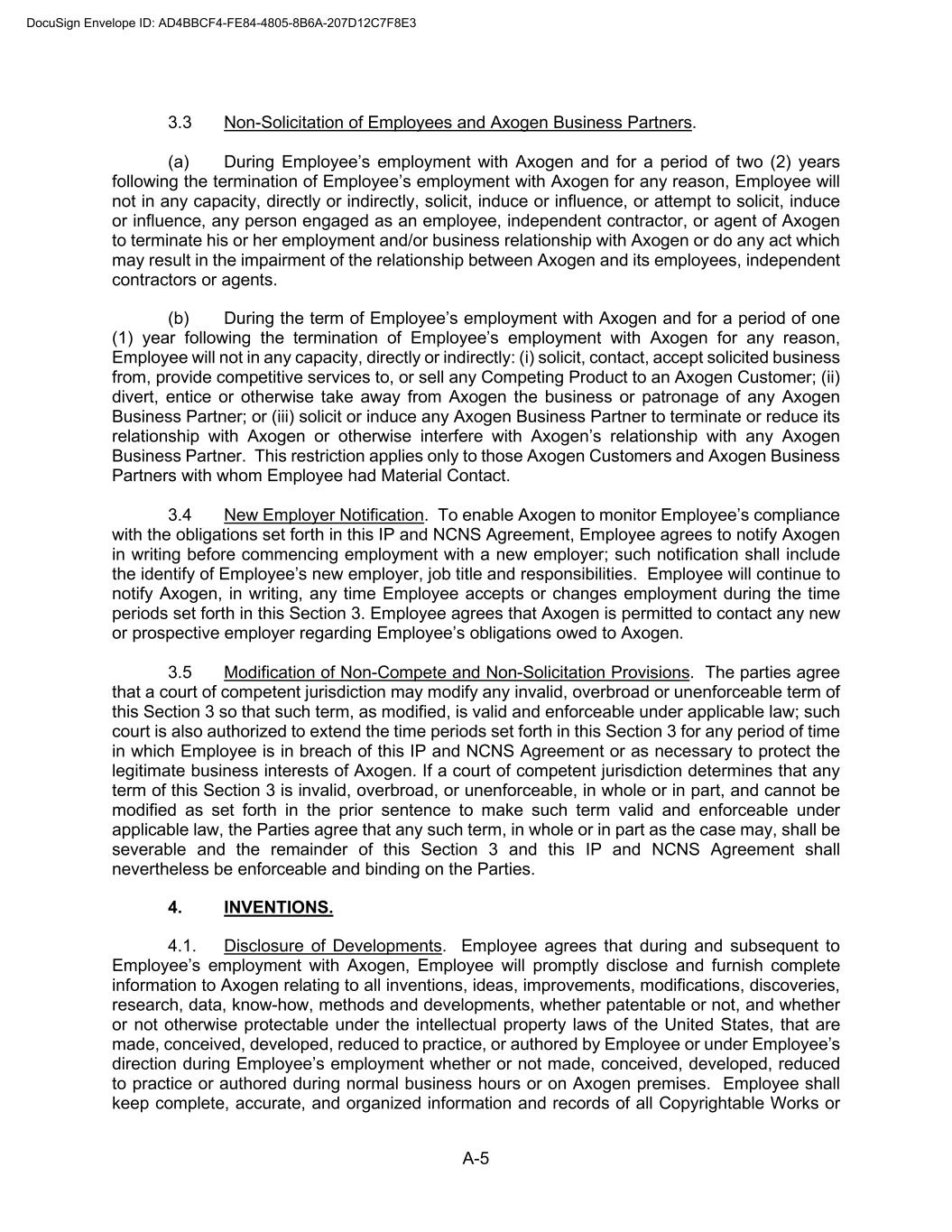 A-5 3.3 Non-Solicitation of Employees and Axogen Business Partners. (a) During Employee’s employment with Axogen and for a period of two (2) years following the termination of Employee’s employment with Axogen for any reason, Employee will not in any capacity, directly or indirectly, solicit, induce or influence, or attempt to solicit, induce or influence, any person engaged as an employee, independent contractor, or agent of Axogen to terminate his or her employment and/or business relationship with Axogen or do any act which may result in the impairment of the relationship between Axogen and its employees, independent contractors or agents. (b) During the term of Employee’s employment with Axogen and for a period of one (1) year following the termination of Employee’s employment with Axogen for any reason, Employee will not in any capacity, directly or indirectly: (i) solicit, contact, accept solicited business from, provide competitive services to, or sell any Competing Product to an Axogen Customer; (ii) divert, entice or otherwise take away from Axogen the business or patronage of any Axogen Business Partner; or (iii) solicit or induce any Axogen Business Partner to terminate or reduce its relationship with Axogen or otherwise interfere with Axogen’s relationship with any Axogen Business Partner. This restriction applies only to those Axogen Customers and Axogen Business Partners with whom Employee had Material Contact. 3.4 New Employer Notification. To enable Axogen to monitor Employee’s compliance with the obligations set forth in this IP and NCNS Agreement, Employee agrees to notify Axogen in writing before commencing employment with a new employer; such notification shall include the identify of Employee’s new employer, job title and responsibilities. Employee will continue to notify Axogen, in writing, any time Employee accepts or changes employment during the time periods set forth in this Section 3. Employee agrees that Axogen is permitted to contact any new or prospective employer regarding Employee’s obligations owed to Axogen. 3.5 Modification of Non-Compete and Non-Solicitation Provisions. The parties agree that a court of competent jurisdiction may modify any invalid, overbroad or unenforceable term of this Section 3 so that such term, as modified, is valid and enforceable under applicable law; such court is also authorized to extend the time periods set forth in this Section 3 for any period of time in which Employee is in breach of this IP and NCNS Agreement or as necessary to protect the legitimate business interests of Axogen. If a court of competent jurisdiction determines that any term of this Section 3 is invalid, overbroad, or unenforceable, in whole or in part, and cannot be modified as set forth in the prior sentence to make such term valid and enforceable under applicable law, the Parties agree that any such term, in whole or in part as the case may, shall be severable and the remainder of this Section 3 and this IP and NCNS Agreement shall nevertheless be enforceable and binding on the Parties. 4. INVENTIONS. 4.1. Disclosure of Developments. Employee agrees that during and subsequent to Employee’s employment with Axogen, Employee will promptly disclose and furnish complete information to Axogen relating to all inventions, ideas, improvements, modifications, discoveries, research, data, know-how, methods and developments, whether patentable or not, and whether or not otherwise protectable under the intellectual property laws of the United States, that are made, conceived, developed, reduced to practice, or authored by Employee or under Employee’s direction during Employee’s employment whether or not made, conceived, developed, reduced to practice or authored during normal business hours or on Axogen premises. Employee shall keep complete, accurate, and organized information and records of all Copyrightable Works or DocuSign Envelope ID: AD4BBCF4-FE84-4805-8B6A-207D12C7F8E3