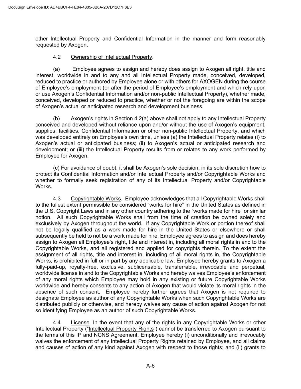 A-6 other Intellectual Property and Confidential Information in the manner and form reasonably requested by Axogen. 4.2 Ownership of Intellectual Property. (a) Employee agrees to assign and hereby does assign to Axogen all right, title and interest, worldwide in and to any and all Intellectual Property made, conceived, developed, reduced to practice or authored by Employee alone or with others for AXOGEN during the course of Employee’s employment (or after the period of Employee’s employment and which rely upon or use Axogen’s Confidential Information and/or non-public Intellectual Property), whether made, conceived, developed or reduced to practice, whether or not the foregoing are within the scope of Axogen’s actual or anticipated research and development business. (b) Axogen’s rights in Section 4.2(a) above shall not apply to any Intellectual Property conceived and developed without reliance upon and/or without the use of Axogen’s equipment, supplies, facilities, Confidential Information or other non-public Intellectual Property, and which was developed entirely on Employee’s own time, unless (a) the Intellectual Property relates (i) to Axogen’s actual or anticipated business; (ii) to Axogen’s actual or anticipated research and development; or (iii) the Intellectual Property results from or relates to any work performed by Employee for Axogen. (c) For avoidance of doubt, it shall be Axogen’s sole decision, in its sole discretion how to protect its Confidential Information and/or Intellectual Property and/or Copyrightable Works and whether to formally seek registration of any of its Intellectual Property and/or Copyrightable Works. 4.3 Copyrightable Works. Employee acknowledges that all Copyrightable Works shall to the fullest extent permissible be considered “works for hire” in the United States as defined in the U.S. Copyright Laws and in any other country adhering to the “works made for hire” or similar notion. All such Copyrightable Works shall from the time of creation be owned solely and exclusively by Axogen throughout the world. If any Copyrightable Work or portion thereof shall not be legally qualified as a work made for hire in the United States or elsewhere or shall subsequently be held to not be a work made for hire, Employee agrees to assign and does hereby assign to Axogen all Employee’s right, title and interest in, including all moral rights in and to the Copyrightable Works, and all registered and applied for copyrights therein. To the extent the assignment of all rights, title and interest in, including of all moral rights in, the Copyrightable Works, is prohibited in full or in part by any applicable law, Employee hereby grants to Axogen a fully-paid-up, royalty-free, exclusive, sublicensable, transferrable, irrevocable and perpetual, worldwide license in and to the Copyrightable Works and hereby waives Employee’s enforcement of any moral rights which Employee may hold in any existing or future Copyrightable Works worldwide and hereby consents to any action of Axogen that would violate its moral rights in the absence of such consent. Employee hereby further agrees that Axogen is not required to designate Employee as author of any Copyrightable Works when such Copyrightable Works are distributed publicly or otherwise, and hereby waives any cause of action against Axogen for not so identifying Employee as an author of such Copyrightable Works. 4.4 License. In the event that any of the rights in any Copyrightable Works or other Intellectual Property (“Intellectual Property Rights”) cannot be transferred to Axogen pursuant to the terms of this IP and NCNS Agreement, Employee hereby (i) unconditionally and irrevocably waives the enforcement of any Intellectual Property Rights retained by Employee, and all claims and causes of action of any kind against Axogen with respect to those rights; and (ii) grants to DocuSign Envelope ID: AD4BBCF4-FE84-4805-8B6A-207D12C7F8E3