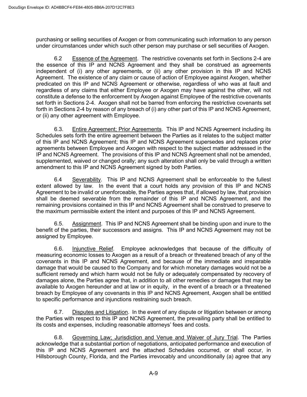 A-9 purchasing or selling securities of Axogen or from communicating such information to any person under circumstances under which such other person may purchase or sell securities of Axogen. 6.2 Essence of the Agreement. The restrictive covenants set forth in Sections 2-4 are the essence of this IP and NCNS Agreement and they shall be construed as agreements independent of (i) any other agreements, or (ii) any other provision in this IP and NCNS Agreement. The existence of any claim or cause of action of Employee against Axogen, whether predicated on this IP and NCNS Agreement or otherwise, regardless of who was at fault and regardless of any claims that either Employee or Axogen may have against the other, will not constitute a defense to the enforcement by Axogen against Employee of the restrictive covenants set forth in Sections 2-4. Axogen shall not be barred from enforcing the restrictive covenants set forth in Sections 2-4 by reason of any breach of (i) any other part of this IP and NCNS Agreement, or (ii) any other agreement with Employee. 6.3. Entire Agreement; Prior Agreements. This IP and NCNS Agreement including its Schedules sets forth the entire agreement between the Parties as it relates to the subject matter of this IP and NCNS Agreement; this IP and NCNS Agreement supersedes and replaces prior agreements between Employee and Axogen with respect to the subject matter addressed in the IP and NCNS Agreement. The provisions of this IP and NCNS Agreement shall not be amended, supplemented, waived or changed orally; any such alteration shall only be valid through a written amendment to this IP and NCNS Agreement signed by both Parties. 6.4 Severability. This IP and NCNS Agreement shall be enforceable to the fullest extent allowed by law. In the event that a court holds any provision of this IP and NCNS Agreement to be invalid or unenforceable, the Parties agrees that, if allowed by law, that provision shall be deemed severable from the remainder of this IP and NCNS Agreement, and the remaining provisions contained in this IP and NCNS Agreement shall be construed to preserve to the maximum permissible extent the intent and purposes of this IP and NCNS Agreement. 6.5. Assignment. This IP and NCNS Agreement shall be binding upon and inure to the benefit of the parties, their successors and assigns. This IP and NCNS Agreement may not be assigned by Employee. 6.6. Injunctive Relief. Employee acknowledges that because of the difficulty of measuring economic losses to Axogen as a result of a breach or threatened breach of any of the covenants in this IP and NCNS Agreement, and because of the immediate and irreparable damage that would be caused to the Company and for which monetary damages would not be a sufficient remedy and which harm would not be fully or adequately compensated by recovery of damages alone, the Parties agree that, in addition to all other remedies or damages that may be available to Axogen hereunder and at law or in equity, in the event of a breach or a threatened breach by Employee of any covenants in this IP and NCNS Agreement, Axogen shall be entitled to specific performance and injunctions restraining such breach. 6.7. Disputes and Litigation. In the event of any dispute or litigation between or among the Parties with respect to this IP and NCNS Agreement, the prevailing party shall be entitled to its costs and expenses, including reasonable attorneys’ fees and costs. 6.8. Governing Law; Jurisdiction and Venue and Waiver of Jury Trial. The Parties acknowledge that a substantial portion of negotiations, anticipated performance and execution of this IP and NCNS Agreement and the attached Schedules occurred, or shall occur, in Hillsborough County, Florida, and the Parties irrevocably and unconditionally (a) agree that any DocuSign Envelope ID: AD4BBCF4-FE84-4805-8B6A-207D12C7F8E3