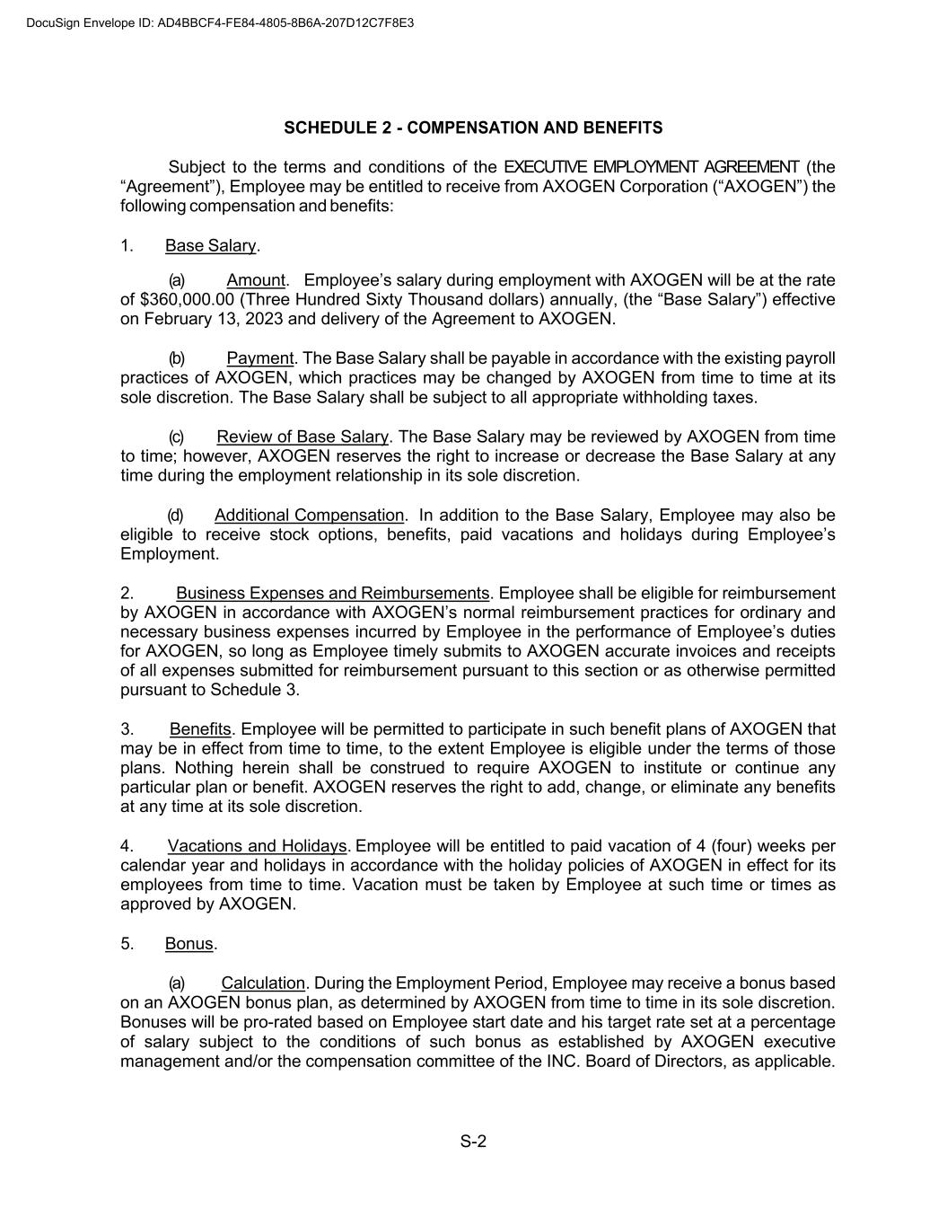 S-2 SCHEDULE 2 - COMPENSATION AND BENEFITS Subject to the terms and conditions of the EXECUTIVE EMPLOYMENT AGREEMENT (the “Agreement”), Employee may be entitled to receive from AXOGEN Corporation (“AXOGEN”) the following compensation and benefits: 1. Base Salary. (a) Amount. Employee’s salary during employment with AXOGEN will be at the rate of $360,000.00 (Three Hundred Sixty Thousand dollars) annually, (the “Base Salary”) effective on February 13, 2023 and delivery of the Agreement to AXOGEN. (b) Payment. The Base Salary shall be payable in accordance with the existing payroll practices of AXOGEN, which practices may be changed by AXOGEN from time to time at its sole discretion. The Base Salary shall be subject to all appropriate withholding taxes. (c) Review of Base Salary. The Base Salary may be reviewed by AXOGEN from time to time; however, AXOGEN reserves the right to increase or decrease the Base Salary at any time during the employment relationship in its sole discretion. (d) Additional Compensation. In addition to the Base Salary, Employee may also be eligible to receive stock options, benefits, paid vacations and holidays during Employee’s Employment. 2. Business Expenses and Reimbursements. Employee shall be eligible for reimbursement by AXOGEN in accordance with AXOGEN’s normal reimbursement practices for ordinary and necessary business expenses incurred by Employee in the performance of Employee’s duties for AXOGEN, so long as Employee timely submits to AXOGEN accurate invoices and receipts of all expenses submitted for reimbursement pursuant to this section or as otherwise permitted pursuant to Schedule 3. 3. Benefits. Employee will be permitted to participate in such benefit plans of AXOGEN that may be in effect from time to time, to the extent Employee is eligible under the terms of those plans. Nothing herein shall be construed to require AXOGEN to institute or continue any particular plan or benefit. AXOGEN reserves the right to add, change, or eliminate any benefits at any time at its sole discretion. 4. Vacations and Holidays. Employee will be entitled to paid vacation of 4 (four) weeks per calendar year and holidays in accordance with the holiday policies of AXOGEN in effect for its employees from time to time. Vacation must be taken by Employee at such time or times as approved by AXOGEN. 5. Bonus. (a) Calculation. During the Employment Period, Employee may receive a bonus based on an AXOGEN bonus plan, as determined by AXOGEN from time to time in its sole discretion. Bonuses will be pro-rated based on Employee start date and his target rate set at a percentage of salary subject to the conditions of such bonus as established by AXOGEN executive management and/or the compensation committee of the INC. Board of Directors, as applicable. DocuSign Envelope ID: AD4BBCF4-FE84-4805-8B6A-207D12C7F8E3
