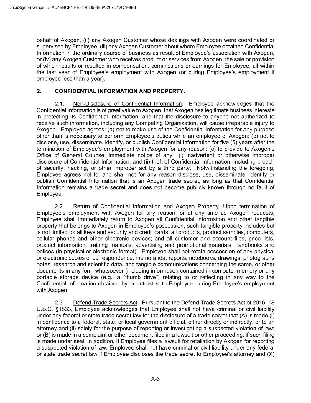 A-3 behalf of Axogen, (ii) any Axogen Customer whose dealings with Axogen were coordinated or supervised by Employee, (iii) any Axogen Customer about whom Employee obtained Confidential Information in the ordinary course of business as result of Employee’s association with Axogen, or (iv) any Axogen Customer who receives product or services from Axogen, the sale or provision of which results or resulted in compensation, commissions or earnings for Employee, all within the last year of Employee’s employment with Axogen (or during Employee’s employment if employed less than a year). 2. CONFIDENTIAL INFORMATION AND PROPERTY. 2.1. Non-Disclosure of Confidential Information. Employee acknowledges that the Confidential Information is of great value to Axogen, that Axogen has legitimate business interests in protecting its Confidential Information, and that the disclosure to anyone not authorized to receive such information, including any Competing Organization, will cause irreparable injury to Axogen. Employee agrees: (a) not to make use of the Confidential Information for any purpose other than is necessary to perform Employee’s duties while an employee of Axogen; (b) not to disclose, use, disseminate, identify, or publish Confidential Information for five (5) years after the termination of Employee’s employment with Axogen for any reason; (c) to provide to Axogen’s Office of General Counsel immediate notice of any (i) inadvertent or otherwise improper disclosure of Confidential Information; and (ii) theft of Confidential Information, including breach of security, hacking, or other improper act by a third party. Notwithstanding the foregoing, Employee agrees not to, and shall not for any reason disclose, use, disseminate, identify or publish Confidential Information that is an Axogen trade secret, as long as that Confidential Information remains a trade secret and does not become publicly known through no fault of Employee. 2.2. Return of Confidential Information and Axogen Property. Upon termination of Employee’s employment with Axogen for any reason, or at any time as Axogen requests, Employee shall immediately return to Axogen all Confidential Information and other tangible property that belongs to Axogen in Employee’s possession; such tangible property includes but is not limited to: all keys and security and credit cards; all products, product samples, computers, cellular phones and other electronic devices; and all customer and account files, price lists, product information, training manuals, advertising and promotional materials, handbooks and polices (in physical or electronic format). Employee shall not retain possession of any physical or electronic copies of correspondence, memoranda, reports, notebooks, drawings, photographs notes, research and scientific data, and tangible communications concerning the same, or other documents in any form whatsoever (including information contained in computer memory or any portable storage device (e.g., a “thumb drive”) relating to or reflecting in any way to the Confidential Information obtained by or entrusted to Employee during Employee’s employment with Axogen. 2.3 Defend Trade Secrets Act. Pursuant to the Defend Trade Secrets Act of 2016, 18 U.S.C. §1833, Employee acknowledges that Employee shall not have criminal or civil liability under any federal or state trade secret law for the disclosure of a trade secret that (A) is made (i) in confidence to a federal, state, or local government official, either directly or indirectly, or to an attorney and (ii) solely for the purpose of reporting or investigating a suspected violation of law; or (B) is made in a complaint or other document filed in a lawsuit or other proceeding, if such filing is made under seal. In addition, if Employee files a lawsuit for retaliation by Axogen for reporting a suspected violation of law, Employee shall not have criminal or civil liability under any federal or state trade secret law if Employee discloses the trade secret to Employee’s attorney and (X) DocuSign Envelope ID: AD4BBCF4-FE84-4805-8B6A-207D12C7F8E3