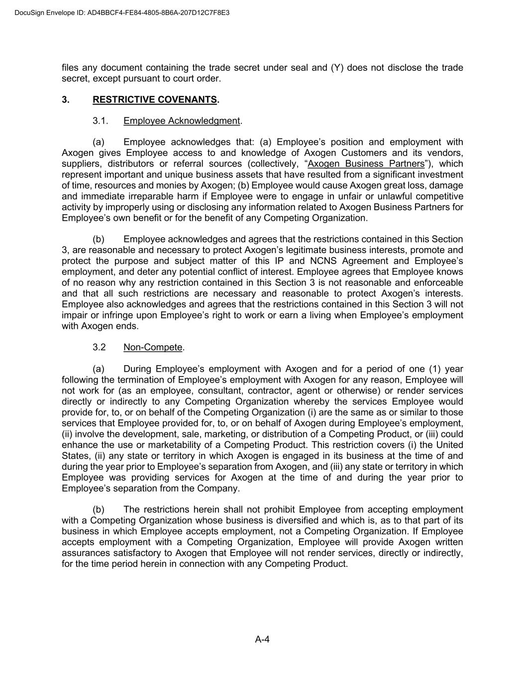 A-4 files any document containing the trade secret under seal and (Y) does not disclose the trade secret, except pursuant to court order. 3. RESTRICTIVE COVENANTS. 3.1. Employee Acknowledgment. (a) Employee acknowledges that: (a) Employee’s position and employment with Axogen gives Employee access to and knowledge of Axogen Customers and its vendors, suppliers, distributors or referral sources (collectively, “Axogen Business Partners”), which represent important and unique business assets that have resulted from a significant investment of time, resources and monies by Axogen; (b) Employee would cause Axogen great loss, damage and immediate irreparable harm if Employee were to engage in unfair or unlawful competitive activity by improperly using or disclosing any information related to Axogen Business Partners for Employee’s own benefit or for the benefit of any Competing Organization. (b) Employee acknowledges and agrees that the restrictions contained in this Section 3, are reasonable and necessary to protect Axogen’s legitimate business interests, promote and protect the purpose and subject matter of this IP and NCNS Agreement and Employee’s employment, and deter any potential conflict of interest. Employee agrees that Employee knows of no reason why any restriction contained in this Section 3 is not reasonable and enforceable and that all such restrictions are necessary and reasonable to protect Axogen’s interests. Employee also acknowledges and agrees that the restrictions contained in this Section 3 will not impair or infringe upon Employee’s right to work or earn a living when Employee’s employment with Axogen ends. 3.2 Non-Compete. (a) During Employee’s employment with Axogen and for a period of one (1) year following the termination of Employee’s employment with Axogen for any reason, Employee will not work for (as an employee, consultant, contractor, agent or otherwise) or render services directly or indirectly to any Competing Organization whereby the services Employee would provide for, to, or on behalf of the Competing Organization (i) are the same as or similar to those services that Employee provided for, to, or on behalf of Axogen during Employee’s employment, (ii) involve the development, sale, marketing, or distribution of a Competing Product, or (iii) could enhance the use or marketability of a Competing Product. This restriction covers (i) the United States, (ii) any state or territory in which Axogen is engaged in its business at the time of and during the year prior to Employee’s separation from Axogen, and (iii) any state or territory in which Employee was providing services for Axogen at the time of and during the year prior to Employee’s separation from the Company. (b) The restrictions herein shall not prohibit Employee from accepting employment with a Competing Organization whose business is diversified and which is, as to that part of its business in which Employee accepts employment, not a Competing Organization. If Employee accepts employment with a Competing Organization, Employee will provide Axogen written assurances satisfactory to Axogen that Employee will not render services, directly or indirectly, for the time period herein in connection with any Competing Product. DocuSign Envelope ID: AD4BBCF4-FE84-4805-8B6A-207D12C7F8E3