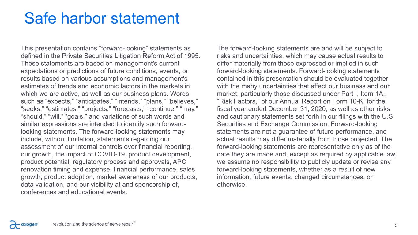 2 This presentation contains “forward-looking” statements as defined in the Private Securities Litigation Reform Act of 1995. These statements are based on management's current expectations or predictions of future conditions, events, or results based on various assumptions and management's estimates of trends and economic factors in the markets in which we are active, as well as our business plans. Words such as “expects,” “anticipates,” “intends,” “plans,” “believes,” “seeks,” “estimates,” “projects,” “forecasts,” “continue,” “may,” “should,” “will,” “goals,” and variations of such words and similar expressions are intended to identify such forward- looking statements. The forward-looking statements may include, without limitation, statements regarding our assessment of our internal controls over financial reporting, our growth, the impact of COVID-19, product development, product potential, regulatory process and approvals, APC renovation timing and expense, financial performance, sales growth, product adoption, market awareness of our products, data validation, and our visibility at and sponsorship of, conferences and educational events. The forward-looking statements are and will be subject to risks and uncertainties, which may cause actual results to differ materially from those expressed or implied in such forward-looking statements. Forward-looking statements contained in this presentation should be evaluated together with the many uncertainties that affect our business and our market, particularly those discussed under Part I, Item 1A., “Risk Factors,” of our Annual Report on Form 10-K, for the fiscal year ended December 31, 2020, as well as other risks and cautionary statements set forth in our filings with the U.S. Securities and Exchange Commission. Forward-looking statements are not a guarantee of future performance, and actual results may differ materially from those projected. The forward-looking statements are representative only as of the date they are made and, except as required by applicable law, we assume no responsibility to publicly update or revise any forward-looking statements, whether as a result of new information, future events, changed circumstances, or otherwise. Safe harbor statement revolutionizing the science of nerve repair™