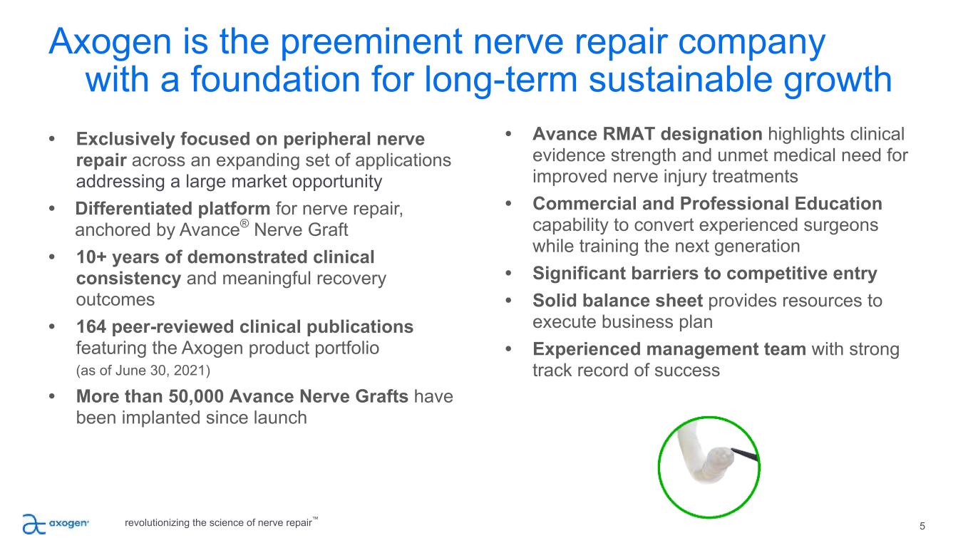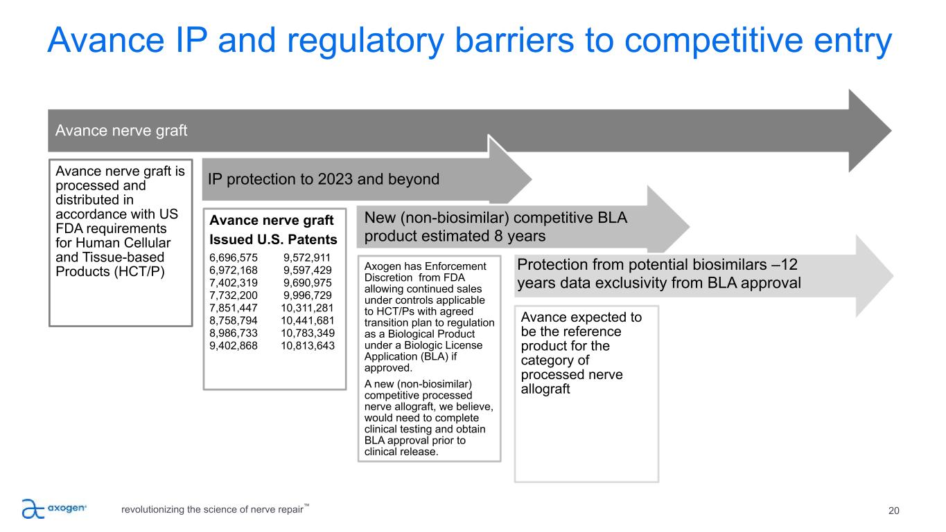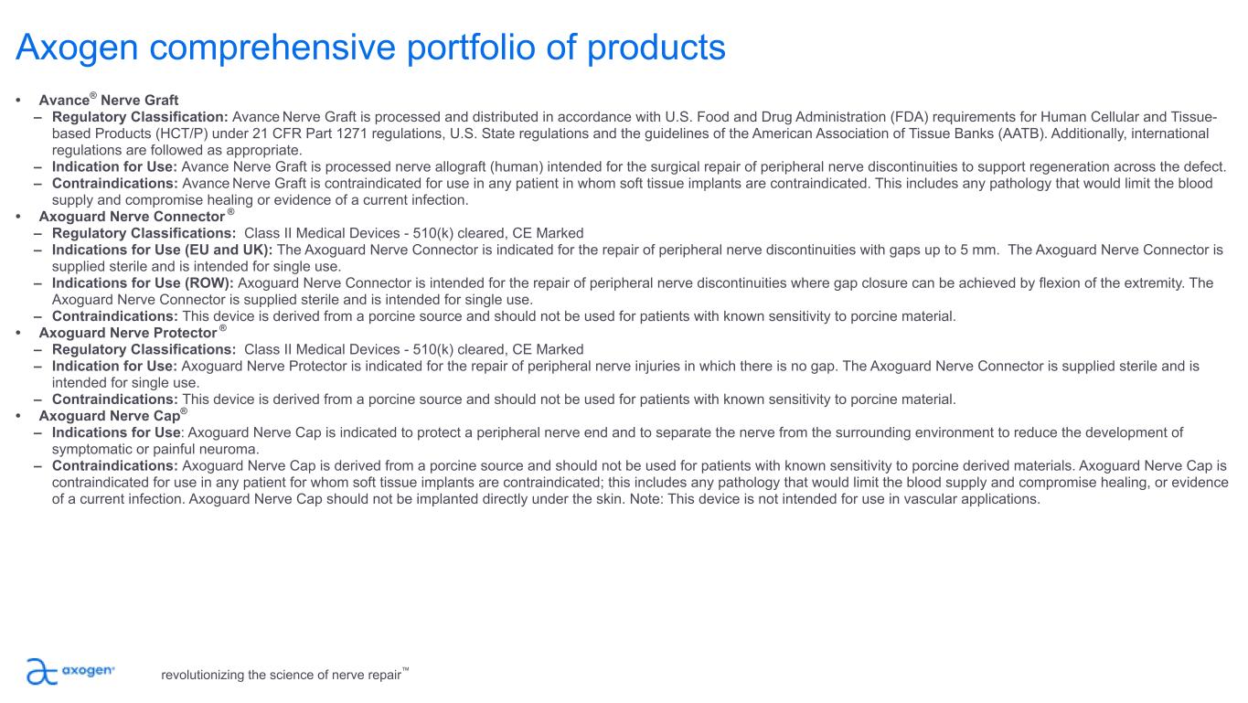 Axogen comprehensive portfolio of products • Avance® Nerve Graft – Regulatory Classification: Avance Nerve Graft is processed and distributed in accordance with U.S. Food and Drug Administration (FDA) requirements for Human Cellular and Tissue- based Products (HCT/P) under 21 CFR Part 1271 regulations, U.S. State regulations and the guidelines of the American Association of Tissue Banks (AATB). Additionally, international regulations are followed as appropriate. – Indication for Use: Avance Nerve Graft is processed nerve allograft (human) intended for the surgical repair of peripheral nerve discontinuities to support regeneration across the defect. – Contraindications: Avance Nerve Graft is contraindicated for use in any patient in whom soft tissue implants are contraindicated. This includes any pathology that would limit the blood supply and compromise healing or evidence of a current infection. • Axoguard Nerve Connector ® – Regulatory Classifications: Class II Medical Devices - 510(k) cleared, CE Marked – Indications for Use (EU and UK): The Axoguard Nerve Connector is indicated for the repair of peripheral nerve discontinuities with gaps up to 5 mm. The Axoguard Nerve Connector is supplied sterile and is intended for single use. – Indications for Use (ROW): Axoguard Nerve Connector is intended for the repair of peripheral nerve discontinuities where gap closure can be achieved by flexion of the extremity. The Axoguard Nerve Connector is supplied sterile and is intended for single use. – Contraindications: This device is derived from a porcine source and should not be used for patients with known sensitivity to porcine material. • Axoguard Nerve Protector ® – Regulatory Classifications: Class II Medical Devices - 510(k) cleared, CE Marked – Indication for Use: Axoguard Nerve Protector is indicated for the repair of peripheral nerve injuries in which there is no gap. The Axoguard Nerve Connector is supplied sterile and is intended for single use. – Contraindications: This device is derived from a porcine source and should not be used for patients with known sensitivity to porcine material. • Axoguard Nerve Cap® – Indications for Use: Axoguard Nerve Cap is indicated to protect a peripheral nerve end and to separate the nerve from the surrounding environment to reduce the development of symptomatic or painful neuroma. – Contraindications: Axoguard Nerve Cap is derived from a porcine source and should not be used for patients with known sensitivity to porcine derived materials. Axoguard Nerve Cap is contraindicated for use in any patient for whom soft tissue implants are contraindicated; this includes any pathology that would limit the blood supply and compromise healing, or evidence of a current infection. Axoguard Nerve Cap should not be implanted directly under the skin. Note: This device is not intended for use in vascular applications. revolutionizing the science of nerve repair™
