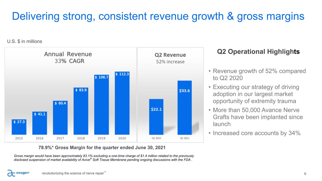 Axogen is the preeminent nerve repair company with a foundation for long-term sustainable growth 5 • Exclusively focused on peripheral nerve repair across an expanding set of applications addressing a large market opportunity • Differentiated platform for nerve repair, anchored by Avance® Nerve Graft • 10+ years of demonstrated clinical consistency and meaningful recovery outcomes • 164 peer-reviewed clinical publications featuring the Axogen product portfolio (as of June 30, 2021) • More than 50,000 Avance Nerve Grafts have been implanted since launch • Avance RMAT designation highlights clinical evidence strength and unmet medical need for improved nerve injury treatments • Commercial and Professional Education capability to convert experienced surgeons while training the next generation • Significant barriers to competitive entry • Solid balance sheet provides resources to execute business plan • Experienced management team with strong track record of success revolutionizing the science of nerve repair™