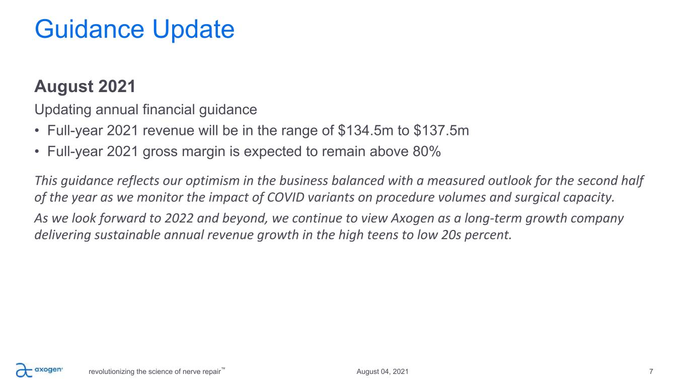 6 78.9%* Gross Margin for the quarter ended June 30, 2021 U.S. $ in millions Delivering strong, consistent revenue growth & gross margins revolutionizing the science of nerve repair™ Q2 Operational Highlights • Revenue growth of 52% compared to Q2 2020 • Executing our strategy of driving adoption in our largest market opportunity of extremity trauma • More than 50,000 Avance Nerve Grafts have been implanted since launch • Increased core accounts by 34% Gross margin would have been approximately 83.1% excluding a one-time charge of $1.4 million related to the previously disclosed suspension of market availability of Avive® Soft Tissue Membrane pending ongoing discussions with the FDA .