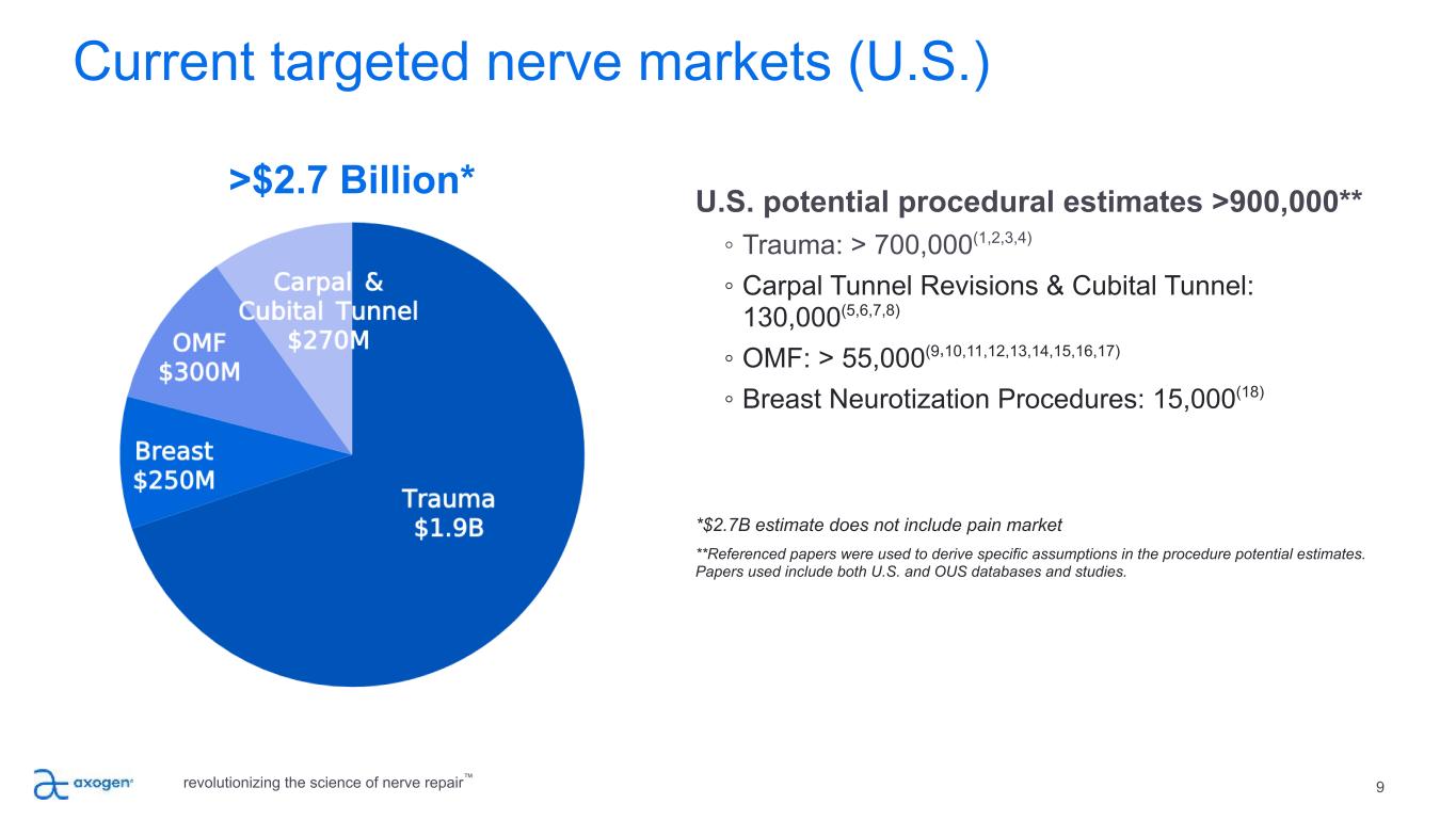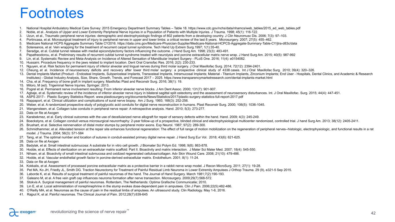 42 Footnotes 1. National Hospital Ambulatory Medical Care Survey: 2015 Emergency Department Summary Tables – Table 18. https://www.cdc.gov/nchs/data/nhamcs/web_tables/2015_ed_web_tables.pdf 2. Noble, et al.. Analysis of Upper and Lower Extremity Peripheral Nerve Injuries in a Population of Patients with Multiple Injuries. J Trauma. 1998; 45(1): 116-122. 3. Uzun, et al., Traumatic peripheral nerve injuries: demographic and electrophysiologic findings of 802 patients from a developing country. J Clin Neuromusc Dis. 2006; 7(3): 97–103. 4. Portincasa, et al. Microsurgical treatment of injury to peripheral nerves in upper and lower limbs: a critical review of the last 8 years. Microsurgery. 2007; 27(5): 455–462. 5. Medicare National HCPS Aggregate Summary Table CY2016. https://data.cms.gov/Medicare-Physician-Supplier/Medicare-National-HCPCS-Aggregate-Summary-Table-CY/jtra-d83c/data 6. Sotereanos, et al. Vein wrapping for the treatment of recurrent carpal tunnel syndrome. Tech Hand Up Extrem Surg.1997; 1(1):35-40. 7. Seradge, et al. Cubital tunnel release with medial epicondylectomy factors influencing the outcome. J Hand Surg Am. 1998; 23(3): 483-491. 8. Papatheodorou, et al. Preliminary results of recurrent cubital tunnel syndrome treated with neurolysis and porcine extracellular matrix nerve wrap. J Hand Surg Am. 2015; 40(5): 987-992 9. Lin, et al. Systematic Review and Meta-Analysis on Incidence of Altered Sensation of Mandibular Implant Surgery - PLoS One. 2016; 11(4): e0154082. 10. Hussaini. Procedure frequency in the jaws related to implant location. Dent Oral Craniofac Res. 2016; 2(2): 230-233. 11. Nguyen, et al. Risk factors for permanent injury of inferior alveolar and lingual nerves during third molar surgery. J Oral Maxillofac Surg. 2014; 72(12): 2394-2401. 12. Cheung, et al. Incidence of neurosensory deficits and recovery after lower third molar surgery: a prospective clinical study of 4338 cases. Int J Oral Maxillofac Surg. 2010; 39(4): 320–326. 13. Dental Implants Market (Product - Endosteal Implants, Subperiosteal Implants, Transosteal Implants, Intramucosal Implants; Material - Titanium Implants, Zirconium Implants; End User - Hospitals, Dental Clinics, and Academic & Research Institutes) - Global Industry Analysis, Size, Share, Growth, Trends, and Forecast 2017 – 2025. https://www.transparencymarketresearch.com/dental-implants-market.html 14. Cha, et al. Frequency of bone graft in implant surgery. Maxillofac Plast and Reconstr Surg. 2016; 38(1): 19. 15. Miloro, M (ed). Trigeminal Nerve Injuries. Springer; 2013. 16. Pogrel et al. Permanent nerve involvement resulting: From inferior alveolar nerve blocks. J Am Dent Assoc. 2000; 131(7): 901-907. 17. Agbaje, et al. Systematic review of the incidence of inferior alveolar nerve injury in bilateral sagittal split osteotomy and the assessment of neurosensory disturbances. Int. J Oral Maxillofac. Surg. 2015; 44(4): 447-451. 18. ASPS 2017– Plastic Surgery Statistics Report. www.plasticsurgery.org/documents/News/Statistics/2017/plastic-surgery-statistics-full-report-2017.pdf 19. Rappaport, et al. Clinical utilization and complications of sural nerve biopsy. Am J Surg. 1993; 166(3): 252-256. 20. Weber, et al. A randomized prospective study of polyglycolic acid conduits for digital nerve reconstruction in humans. Plast Reconstr Surg. 2000; 106(5): 1036-1045. 21. Wangensteen, et al. Collagen tube conduits in peripheral nerve repair: A retrospective analysis. Hand. 2010; 5(3): 273-277. 22. Data on file at Axogen 23. Karabekmez, et al. Early clinical outcomes with the use of decellularized nerve allograft for repair of sensory defects within the hand. Hand. 2009; 4(3): 245-249. 24. Boeckstyns, et al. Collagen conduit versus microsurgical neurorrhaphy: 2-year follow-up of a prospective, blinded clinical and electrophysiological multicenter randomized, controlled trial. J hand Surg Am. 2013; 38(12): 2405-2411. 25. Brushart, et al. Selective reinnervation of distal motor stumps by peripheral motor axons. Exp Neurol. 1987; 97(2): 289-300. 26. Schmidhammer, et al. Alleviated tension at the repair site enhances functional regeneration: The effect of full range of motion mobilization on the regeneration of peripheral nerves--histologic, electrophysiologic, and functional results in a rat model. J Trauma. 2004; 56(3): 571-584 27. Tang, et al. The optimal number and location of sutures in conduit-assisted primary digital nerve repair. J Hand Surg Eur Vol. 2018; 43(6): 621-625. 28. Data on file at Axogen 29. Badylak, et al. Small intestinal submucosa: A substrate for in vitro cell growth. J Biomater Sci Polym Ed. 1998; 9(8): 863-878. 30. Hodde, et al. Effects of sterilization on an extracellular matrix scaffold: Part II. Bioactivity and matrix interaction. J Mater Sci Mater Med. 2007; 18(4): 545-550. 31. Nihsen, et al. Bioactivity of small intestinal submucosa and oxidized regenerated cellulose/collagen. Adv Skin Wound Care. 2008; 21(10): 479-486. 32. Hodde, et al. Vascular endothelial growth factor in porcine-derived extracellular matrix. Endothelium. 2001; 8(1): 11-24. 33. Data on file at Axogen 34. Kokkalis, et al. Assessment of processed porcine extracellular matrix as a protective barrier in a rabbit nerve wrap model. J Recon MicroSurg. 2011; 27(1): 19-28. 35. Pet MA, Ko JH, Friedly JL, Smith DG. Traction Neurectomy for Treatment of Painful Residual Limb Neuroma in Lower Extremity Amputees J Orthop Trauma. 29 (9), e321-5 Sep 2015. 36. Laborde K, et al. Results of surgical treatment of painful neuromas of the hand. The Journal of Hand Surgery. March 1981;7(2):190-193. 37. Galeano M, et al. A free vein graft cap influences neuroma formation after nerve transection. Microsurgery. 2009;29(7):568-572. 38. Stokvis A. Surgical management of painful neuromas. Rotterdam, The Netherlands: Optima Grafische Communicatie; 2010. 39. Lin E, et al. Local administration of norephinephrine in the stump evokes dose-dependent pain in amputees. Clin J Pai