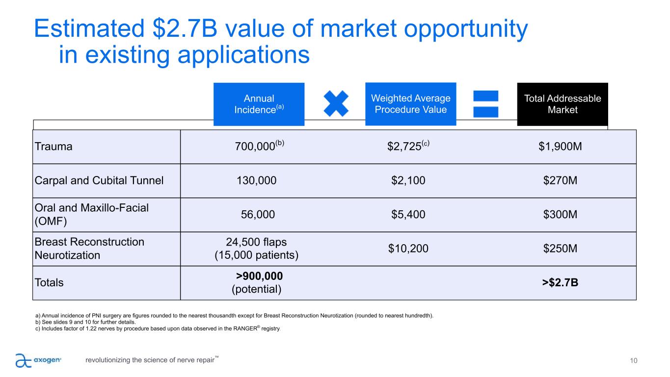 Current targeted nerve markets (U.S.) 9 U.S. potential procedural estimates >900,000** ◦ Trauma: > 700,000(1,2,3,4) ◦ Carpal Tunnel Revisions & Cubital Tunnel: 130,000(5,6,7,8) ◦ OMF: > 55,000(9,10,11,12,13,14,15,16,17) ◦ Breast Neurotization Procedures: 15,000(18) *$2.7B estimate does not include pain market **Referenced papers were used to derive specific assumptions in the procedure potential estimates. Papers used include both U.S. and OUS databases and studies. >$2.7 Billion* revolutionizing the science of nerve repair™