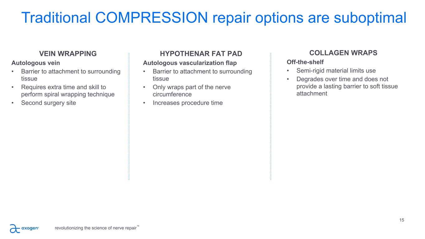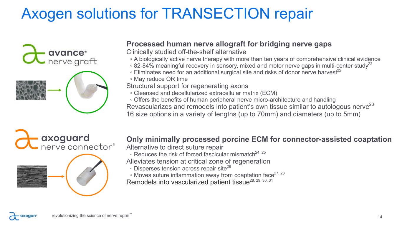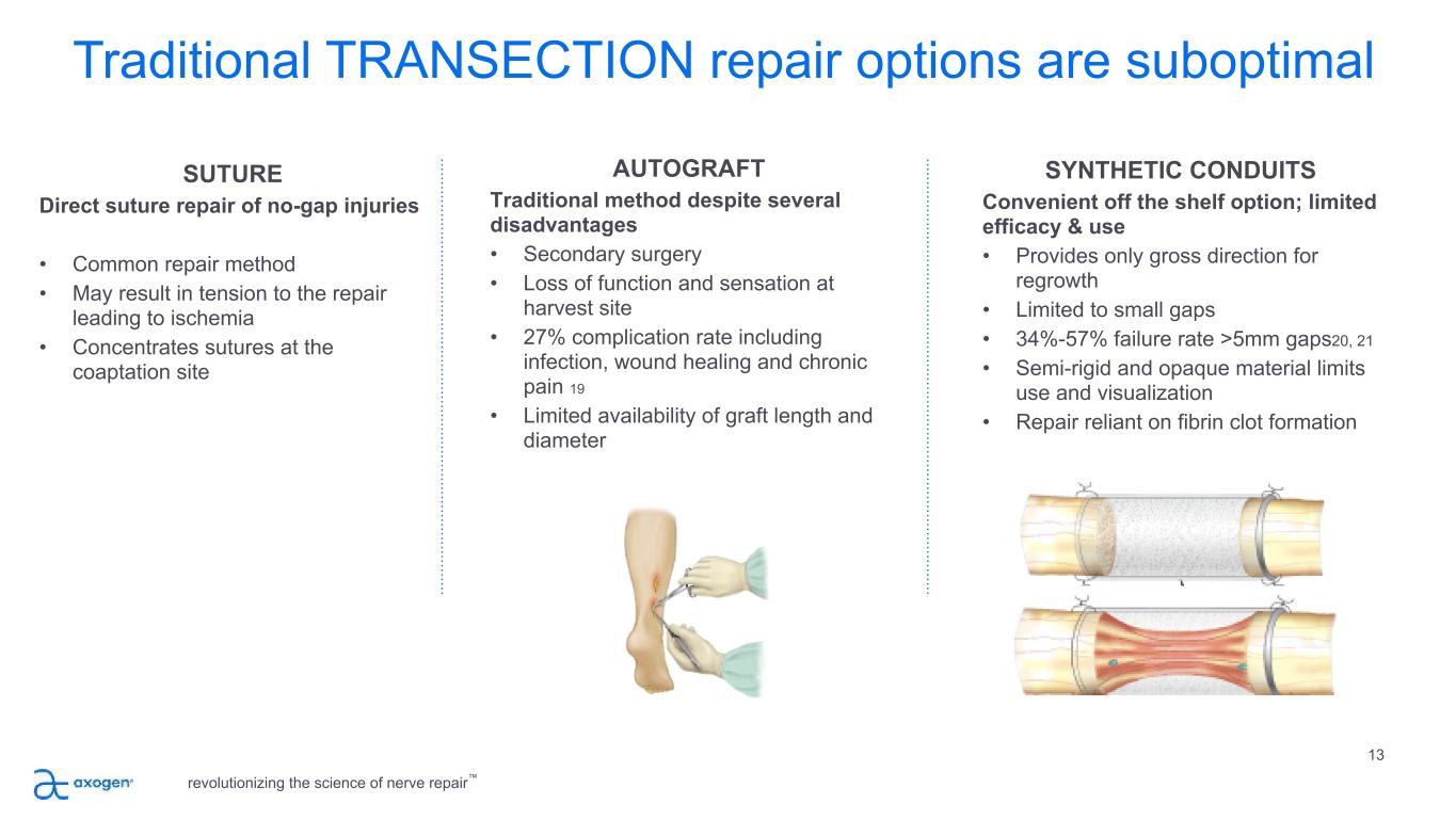 Traditional TRANSECTION repair options are suboptimal 13 SUTURE Direct suture repair of no-gap injuries • Common repair method • May result in tension to the repair leading to ischemia • Concentrates sutures at the coaptation site AUTOGRAFT Traditional method despite several disadvantages • Secondary surgery • Loss of function and sensation at harvest site • 27% complication rate including infection, wound healing and chronic pain 19 • Limited availability of graft length and diameter SYNTHETIC CONDUITS Convenient off the shelf option; limited efficacy & use • Provides only gross direction for regrowth • Limited to small gaps • 34%-57% failure rate >5mm gaps20, 21 • Semi-rigid and opaque material limits use and visualization • Repair reliant on fibrin clot formation revolutionizing the science of nerve repair™