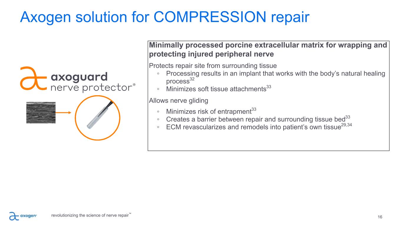 Traditional COMPRESSION repair options are suboptimal 15 VEIN WRAPPING Autologous vein • Barrier to attachment to surrounding tissue • Requires extra time and skill to perform spiral wrapping technique • Second surgery site HYPOTHENAR FAT PAD Autologous vascularization flap • Barrier to attachment to surrounding tissue • Only wraps part of the nerve circumference • Increases procedure time COLLAGEN WRAPS Off-the-shelf • Semi-rigid material limits use • Degrades over time and does not provide a lasting barrier to soft tissue attachment revolutionizing the science of nerve repair™