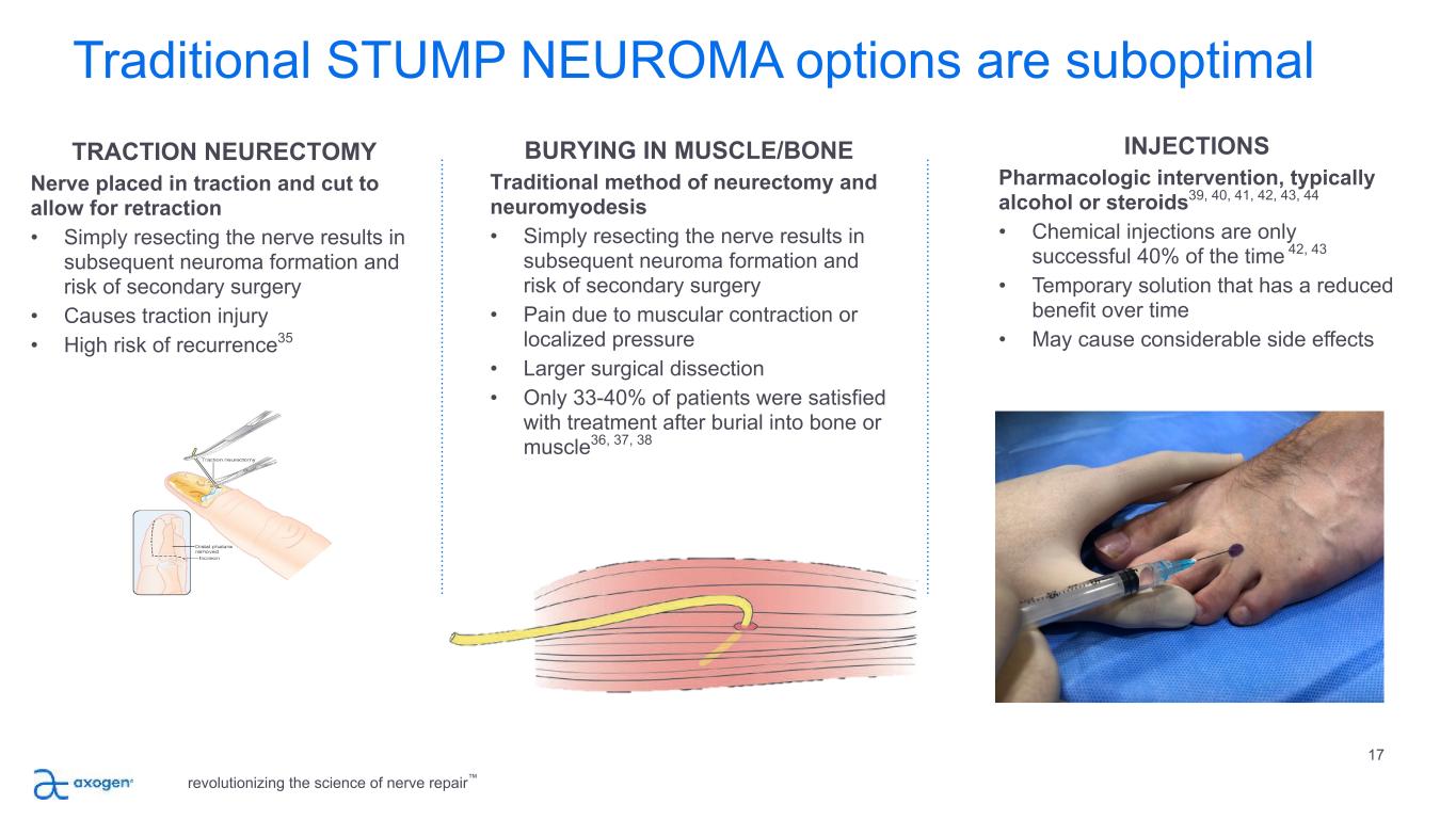 16 Axogen solution for COMPRESSION repair Minimally processed porcine extracellular matrix for wrapping and protecting injured peripheral nerve Protects repair site from surrounding tissue ◦ Processing results in an implant that works with the body’s natural healing process32 ◦ Minimizes soft tissue attachments33 Allows nerve gliding ◦ Minimizes risk of entrapment33 ◦ Creates a barrier between repair and surrounding tissue bed33 ◦ ECM revascularizes and remodels into patient’s own tissue29,34 revolutionizing the science of nerve repair™