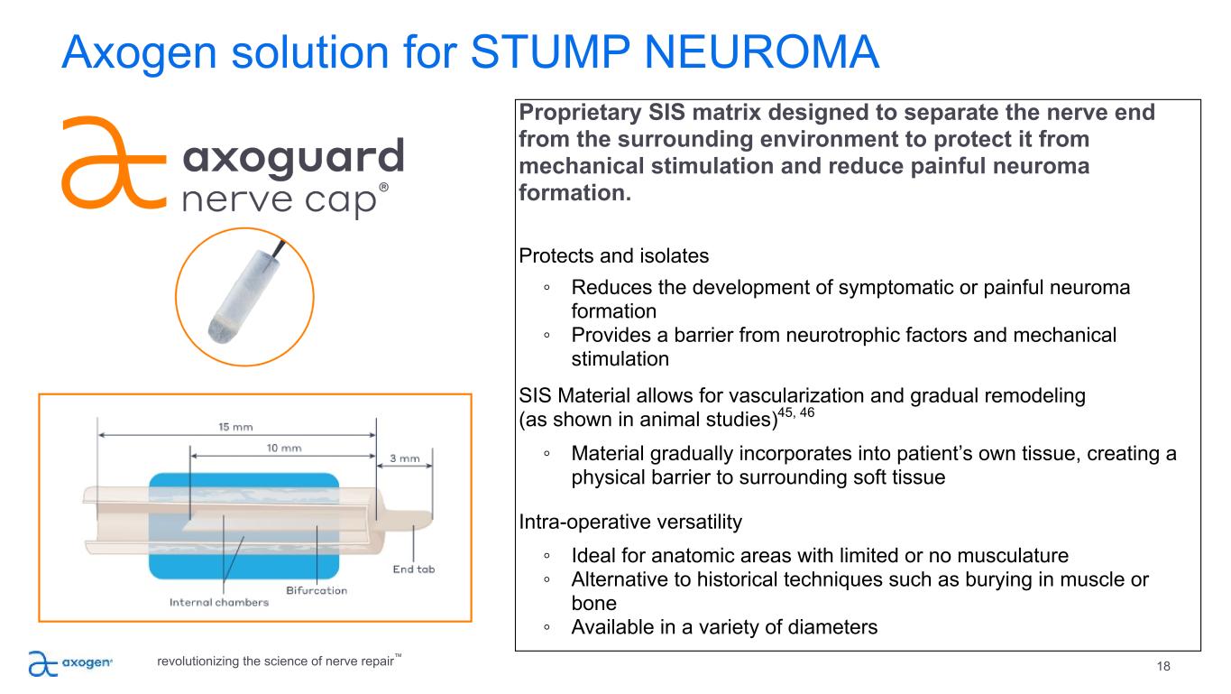Traditional STUMP NEUROMA options are suboptimal 17 TRACTION NEURECTOMY Nerve placed in traction and cut to allow for retraction • Simply resecting the nerve results in subsequent neuroma formation and risk of secondary surgery • Causes traction injury • High risk of recurrence35 BURYING IN MUSCLE/BONE Traditional method of neurectomy and neuromyodesis • Simply resecting the nerve results in subsequent neuroma formation and risk of secondary surgery • Pain due to muscular contraction or localized pressure • Larger surgical dissection • Only 33-40% of patients were satisfied with treatment after burial into bone or muscle36, 37, 38 INJECTIONS Pharmacologic intervention, typically alcohol or steroids39, 40, 41, 42, 43, 44 • Chemical injections are only successful 40% of the time 42, 43 • Temporary solution that has a reduced benefit over time • May cause considerable side effects revolutionizing the science of nerve repair™
