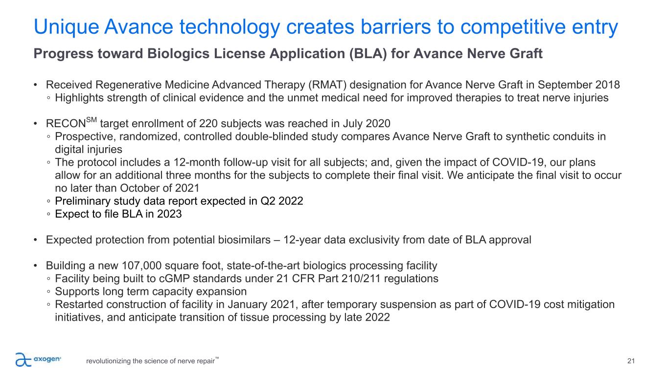 20 Avance IP and regulatory barriers to competitive entry Avance nerve graft is processed and distributed in accordance with US FDA requirements for Human Cellular and Tissue-based Products (HCT/P) Avance nerve graft Issued U.S. Patents 6,696,575 9,572,911 6,972,168 9,597,429 7,402,319 9,690,975 7,732,200 9,996,729 7,851,447 10,311,281 8,758,794 10,441,681 8,986,733 10,783,349 9,402,868 10,813,643 Axogen has Enforcement Discretion from FDA allowing continued sales under controls applicable to HCT/Ps with agreed transition plan to regulation as a Biological Product under a Biologic License Application (BLA) if approved. A new (non-biosimilar) competitive processed nerve allograft, we believe, would need to complete clinical testing and obtain BLA approval prior to clinical release. Avance expected to be the reference product for the category of processed nerve allograft Avance nerve graft IP protection to 2023 and beyond New (non-biosimilar) competitive BLA product estimated 8 years Protection from potential biosimilars –12 years data exclusivity from BLA approval revolutionizing the science of nerve repair™