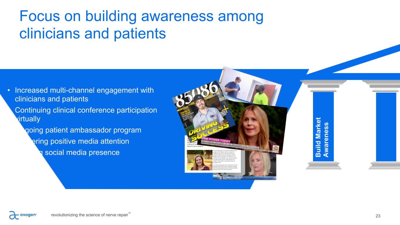 22 Market development strategy B ui ld M ar ke t A w ar en es s Ed uc at e Su rg eo ns , D ev el op A dv oc at es G ro w B od y of C lin ic al E vi de nc e Ex ec ut e Sa le s Pl an Ex pa nd P ro du ct P ip el in e + A pp lic at io ns revolutionizing the science of nerve repair™