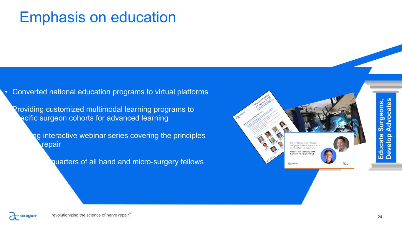 23 Focus on building awareness among clinicians and patients B ui ld M ar ke t A w ar en es s G ro w B od y of C lin ic al E vi de nc e Ex ec ut e Sa le s P la n Ex pa nd P ro du ct P ip el in e + A pp lic at io ns • Increased multi-channel engagement with clinicians and patients • Continuing clinical conference participation virtually • Ongoing patient ambassador program • Garnering positive media attention • Growing social media presence revolutionizing the science of nerve repair™