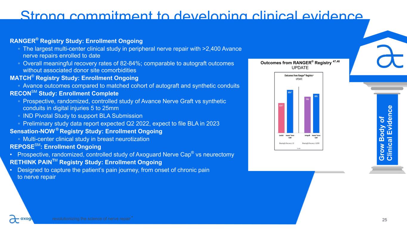 24 PI LL A R 2 Emphasis on education B ui ld M ar ke t A w ar en es s Ed uc at e Su rg eo ns , D ev el op A dv oc at es G ro w B od y of C lin ic al E vi de nc e Ex ec ut e Sa le s P la n Ex pa nd P ro du ct P ip el in e + A pp lic at io ns • Converted national education programs to virtual platforms • Providing customized multimodal learning programs to specific surgeon cohorts for advanced learning • Ongoing interactive webinar series covering the principles of nerve repair • Train three-quarters of all hand and micro-surgery fellows annually revolutionizing the science of nerve repair™