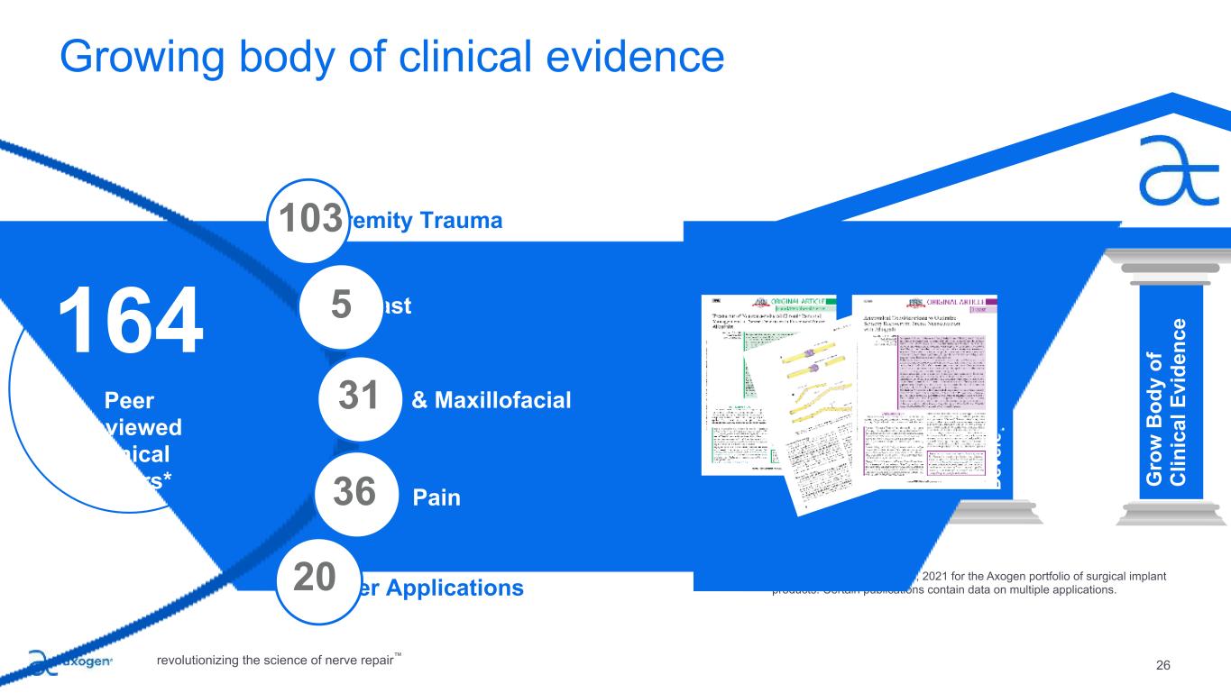 25 PI LL A R 3 Strong commitment to developing clinical evidence B ui ld M ar ke t A w ar en es s Ed uc at e Su rg eo ns , D ev el op A dv oc at es G ro w B od y of C lin ic al E vi de nc e Ex ec ut e Sa le s P la n Ex pa nd P ro du ct P ip el in e + A pp lic at io ns RANGER® Registry Study: Enrollment Ongoing ◦ The largest multi-center clinical study in peripheral nerve repair with >2,400 Avance nerve repairs enrolled to date ◦ Overall meaningful recovery rates of 82-84%; comparable to autograft outcomes without associated donor site comorbidities MATCH® Registry Study: Enrollment Ongoing ◦ Avance outcomes compared to matched cohort of autograft and synthetic conduits RECONSM Study: Enrollment Complete ◦ Prospective, randomized, controlled study of Avance Nerve Graft vs synthetic conduits in digital injuries 5 to 25mm ◦ IND Pivotal Study to support BLA Submission ◦ Preliminary study data report expected Q2 2022, expect to file BLA in 2023 Sensation-NOW ® Registry Study: Enrollment Ongoing ◦ Multi-center clinical study in breast neurotization REPOSESM: Enrollment Ongoing • Prospective, randomized, controlled study of Axoguard Nerve Cap® vs neurectomy RETHINK PAINTM Registry Study: Enrollment Ongoing • Designed to capture the patient’s pain journey, from onset of chronic pain to nerve repair revolutionizing the science of nerve repair™ Outcomes from RANGER® Registry 47,48 UPDATE