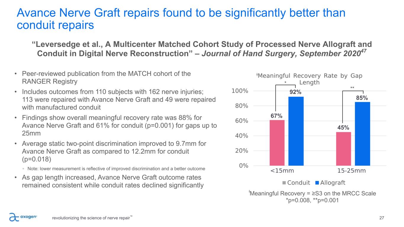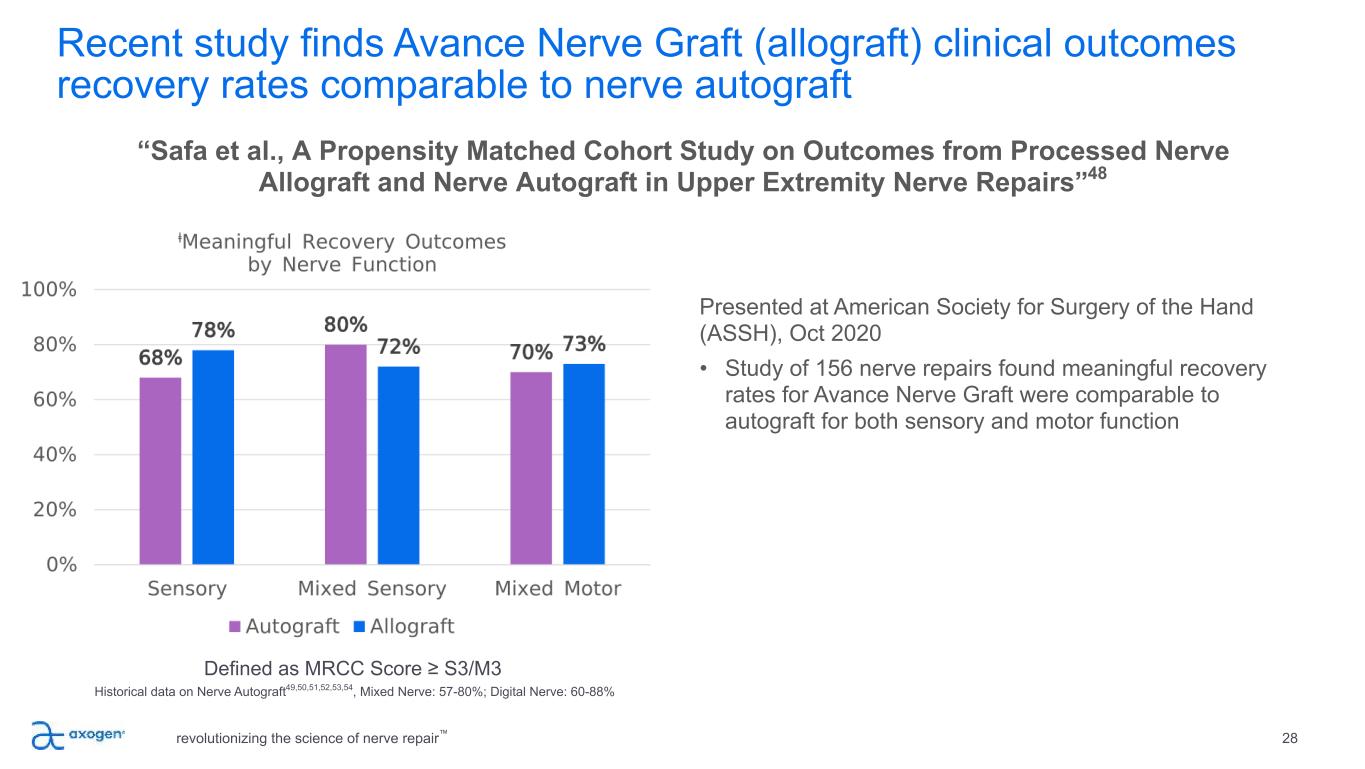 Avance Nerve Graft repairs found to be significantly better than conduit repairs revolutionizing the science of nerve repair™ 27 • Peer-reviewed publication from the MATCH cohort of the RANGER Registry • Includes outcomes from 110 subjects with 162 nerve injuries; 113 were repaired with Avance Nerve Graft and 49 were repaired with manufactured conduit • Findings show overall meaningful recovery rate was 88% for Avance Nerve Graft and 61% for conduit (p=0.001) for gaps up to 25mm • Average static two-point discrimination improved to 9.7mm for Avance Nerve Graft as compared to 12.2mm for conduit (p=0.018) ◦ Note: lower measurement is reflective of improved discrimination and a better outcome • As gap length increased, Avance Nerve Graft outcome rates remained consistent while conduit rates declined significantly “Leversedge et al., A Multicenter Matched Cohort Study of Processed Nerve Allograft and Conduit in Digital Nerve Reconstruction” – Journal of Hand Surgery, September 202047 ⱡMeaningful Recovery = ≥S3 on the MRCC Scale *p=0.008, **p=0.001 67% 92% 45% 85% * **