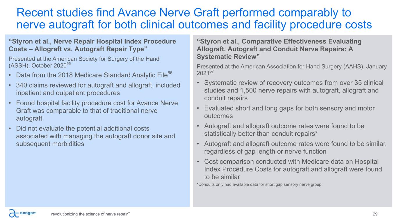 Recent study finds Avance Nerve Graft (allograft) clinical outcomes recovery rates comparable to nerve autograft revolutionizing the science of nerve repair™ 28 “Safa et al., A Propensity Matched Cohort Study on Outcomes from Processed Nerve Allograft and Nerve Autograft in Upper Extremity Nerve Repairs”48 Presented at American Society for Surgery of the Hand (ASSH), Oct 2020 • Study of 156 nerve repairs found meaningful recovery rates for Avance Nerve Graft were comparable to autograft for both sensory and motor function Defined as MRCC Score ≥ S3/M3 Historical data on Nerve Autograft49,50,51,52,53,54, Mixed Nerve: 57-80%; Digital Nerve: 60-88%