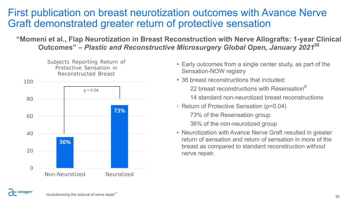 First publication on breast neurotization outcomes with Avance Nerve Graft demonstrated greater return of protective sensation revolutionizing the science of nerve repair™ 30 • Early outcomes from a single center study, as part of the Sensation-NOW registry • 36 breast reconstructions that included: 22 breast reconstructions with Resensation® 14 standard non-neurotized breast reconstructions ◦ Return of Protective Sensation (p=0.04) 73% of the Resensation group 36% of the non-neurotized group ▪ Neurotization with Avance Nerve Graft resulted in greater return of sensation and return of sensation in more of the breast as compared to standard reconstruction without nerve repair. “Momeni et al., Flap Neurotization in Breast Reconstruction with Nerve Allografts: 1-year Clinical Outcomes” – Plastic and Reconstructive Microsurgery Global Open, January 202158 p = 0.04