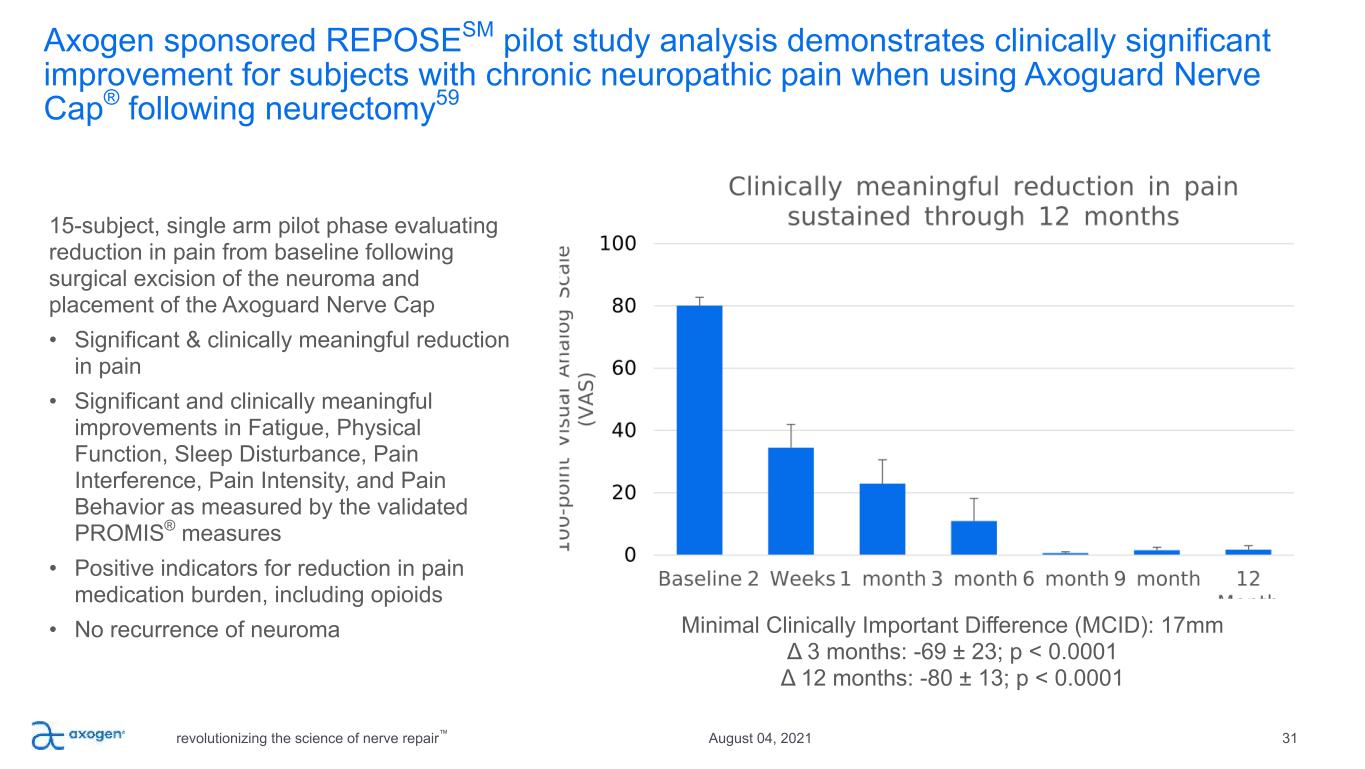 Axogen sponsored REPOSESM pilot study analysis demonstrates clinically significant improvement for subjects with chronic neuropathic pain when using Axoguard Nerve Cap® following neurectomy59 revolutionizing the science of nerve repair™ 31August 04, 2021 15-subject, single arm pilot phase evaluating reduction in pain from baseline following surgical excision of the neuroma and placement of the Axoguard Nerve Cap • Significant & clinically meaningful reduction in pain • Significant and clinically meaningful improvements in Fatigue, Physical Function, Sleep Disturbance, Pain Interference, Pain Intensity, and Pain Behavior as measured by the validated PROMIS® measures • Positive indicators for reduction in pain medication burden, including opioids • No recurrence of neuroma Minimal Clinically Important Difference (MCID): 17mm Δ 3 months: -69 ± 23; p < 0.0001 Δ 12 months: -80 ± 13; p < 0.0001