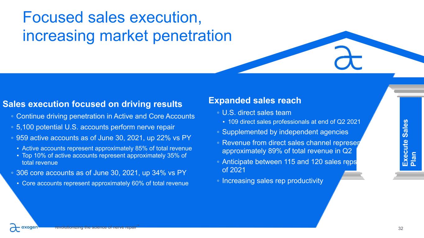 32 PI LL A R 4 Focused sales execution, increasing market penetration B ui ld M ar ke t A w ar en es s Ed uc at e Su rg eo ns , D ev el op A dv oc at es G ro w B od y of C lin ic al E vi de nc e Ex ec ut e Sa le s Pl an Ex pa nd P ro du ct P ip el in e + A pp lic at io ns Sales execution focused on driving results ◦ Continue driving penetration in Active and Core Accounts ◦ 5,100 potential U.S. accounts perform nerve repair ◦ 959 active accounts as of June 30, 2021, up 22% vs PY ▪ Active accounts represent approximately 85% of total revenue ▪ Top 10% of active accounts represent approximately 35% of total revenue ◦ 306 core accounts as of June 30, 2021, up 34% vs PY ▪ Core accounts represent approximately 60% of total revenue Expanded sales reach ◦ U.S. direct sales team ▪ 109 direct sales pr fessionals at end of Q2 2021 ◦ Supplemented by independent agencies ◦ Revenue from direct sales channel represented approximately 89% of total revenue in Q2 ◦ Anticipate between 115 and 120 sales reps by end of 2021 ◦ Increasing sales rep productivity revolutionizing the science of nerve repair™
