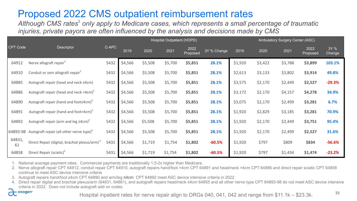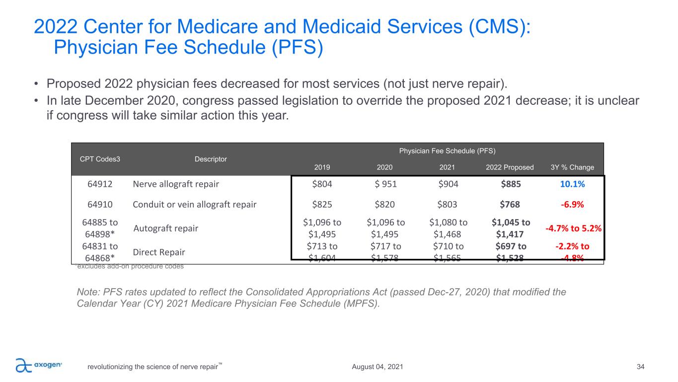CPT Code Descriptor C-APC Hospital Outpatient (HOPD) Ambulatory Surgery Center (ASC) 2019 2020 2021 2022 Proposed 3Y % Change 2019 2020 2021 2022 Proposed 3Y % Change 64912 Nerve allograft repair2 5432 $4,566 $5,508 $5,700 $5,851 28.1% $1,920 $3,422 $3,788 $3,899 103.1% 64910 Conduit or vein allograft repair2 5432 $4,566 $5,508 $5,700 $5,851 28.1% $2,613 $3,133 $3,802 $3,914 49.8% 64885 Autograft repair (head and neck ≤4cm) 5432 $4,566 $5,508 $5,700 $5,851 28.1% $3,575 $2,170 $2,449 $2,527 -29.3% 64886 Autograft repair (head and neck >4cm)2 5432 $4,566 $5,508 $5,700 $5,851 28.1% $3,172 $2,170 $4,157 $4,278 34.9% 64890 Autograft repair (hand and foot≤4cm)3 5432 $4,566 $5,508 $5,700 $5,851 28.1% $3,075 $2,170 $2,499 $3,281 6.7% 64891 Autograft repair (hand and foot>4cm)2 5432 $4,566 $5,508 $5,700 $5,851 28.1% $1,920 $2,829 $3,185 $3,281 70.9% 64892 Autograft repair (arm and leg ≤4cm)4 5432 $4,566 $5,508 $5,700 $5,851 28.1% $1,920 $2,170 $2,449 $3,751 95.4% 64893-98 Autograft repair (all other nerve type)4 5432 $4,566 $5,508 $5,700 $5,851 28.1% $1,920 $2,170 $2,499 $2,527 31.6% 64831, 61 Direct Repair (digital, brachial plexus/arm) 4 5431 $4,566 $1,719 $1,754 $1,802 -60.5% $1,920 $797 $809 $834 -56.6% 64858 Direct Repair (sciatic)2 5431 $4,566 $1,719 $1,754 $1,802 -60.5% $1,920 $797 $1,434 $1,474 -23.2% Proposed 2022 CMS outpatient reimbursement rates 33 Although CMS rates1 only apply to Medicare cases, which represents a small percentage of traumatic injuries, private payors are often influenced by the analysis and decisions made by CMS 1. National average payment rates. Commercial payments are traditionally 1.5-2x higher than Medicare. 2. Nerve allograft repair CPT 64912, conduit repair CPT 64910, autograft repairs hand/foot >4cm CPT 64891 and head/neck >4cm CPT 64886 and direct repair sciatic CPT 64858 continue to meet ASC device intensive criteria 3. Autograft repairs hand/foot ≤4cm CPT 64890 and arm/leg ≤4cm CPT 64892 meet ASC device intensive criteria in 2022 4. Direct repair digital and brachial plexus/arm (64831, 64861), and autograft repairs head/neck ≤4cm 64855 and all other nerve type CPT 64893-98 do not meet ASC device intensive criteria in 2022. Does not include autograft add on codes. Hospital inpatient rates for nerve repair align to DRGs 040, 041, 042 and range from $11.1k – $23.3k.