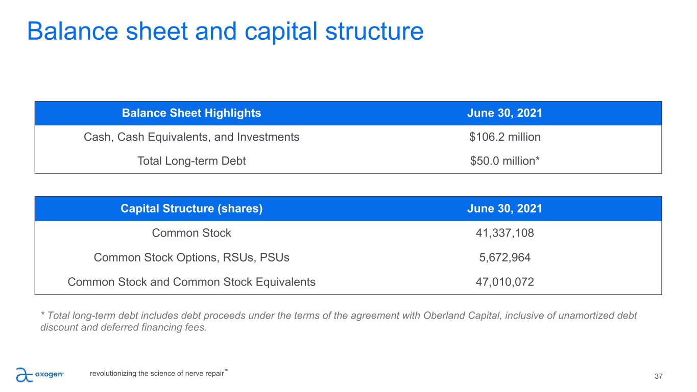 37 Balance Sheet Highlights June 30, 2021 Cash, Cash Equivalents, and Investments $106.2 million Total Long-term Debt $50.0 million* Capital Structure (shares) June 30, 2021 Common Stock 41,337,108 Common Stock Options, RSUs, PSUs 5,672,964 Common Stock and Common Stock Equivalents 47,010,072 Balance sheet and capital structure revolutionizing the science of nerve repair™ * Total long-term debt includes debt proceeds under the terms of the agreement with Oberland Capital, inclusive of unamortized debt discount and deferred financing fees.