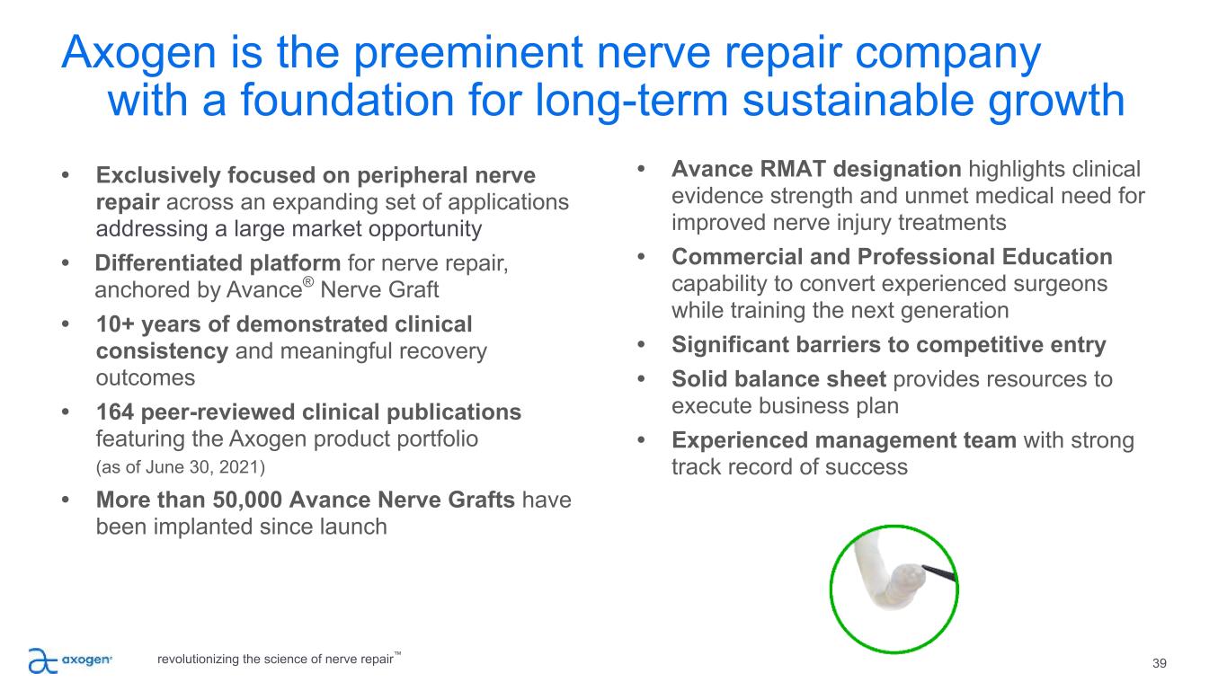 Axogen is the preeminent nerve repair company with a foundation for long-term sustainable growth 39 • Exclusively focused on peripheral nerve repair across an expanding set of applications addressing a large market opportunity • Differentiated platform for nerve repair, anchored by Avance® Nerve Graft • 10+ years of demonstrated clinical consistency and meaningful recovery outcomes • 164 peer-reviewed clinical publications featuring the Axogen product portfolio (as of June 30, 2021) • More than 50,000 Avance Nerve Grafts have been implanted since launch • Avance RMAT designation highlights clinical evidence strength and unmet medical need for improved nerve injury treatments • Commercial and Professional Education capability to convert experienced surgeons while training the next generation • Significant barriers to competitive entry • Solid balance sheet provides resources to execute business plan • Experienced management team with strong track record of success revolutionizing the science of nerve repair™