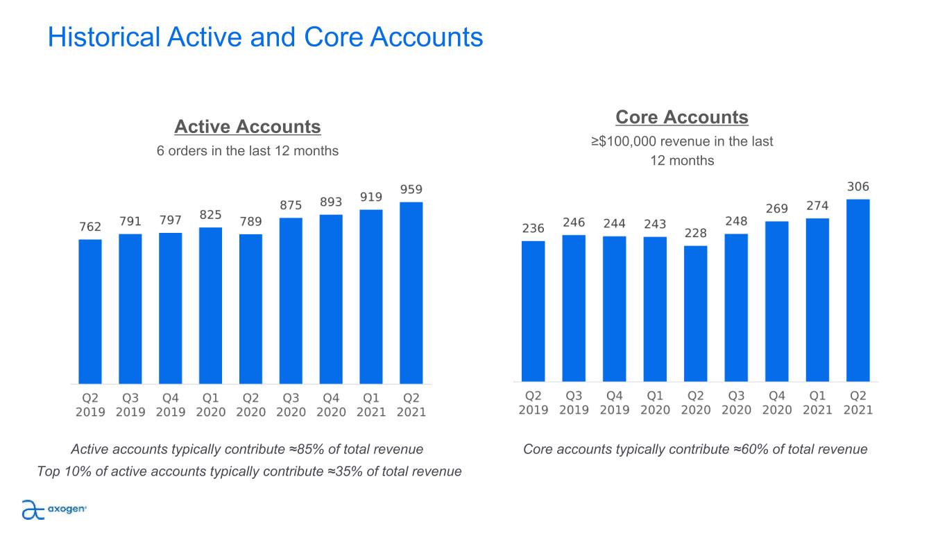 Historical Active and Core Accounts Active accounts typically contribute ≈85% of total revenue Top 10% of active accounts typically contribute ≈35% of total revenue Active Accounts 6 orders in the last 12 months Core accounts typically contribute ≈60% of total revenue Core Accounts ≥$100,000 revenue in the last 12 months