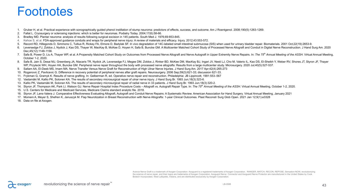 43 Footnotes 1. Gruber H, et al. Practical experience with sonographically guided phenol instillation of stump neuroma: predictors of effects, success, and outcome. Am J Roentgenol. 2008;190(5):1263-1269. 2. Fallat L. Cryosurgery or sclerosing injections: which is better for neuromas. Podiatry Today. 2004;17(6):58-66. 3. Bradley MD. Plantar neuroma: analysis of results following surgical excision in 145 patients. South Med J. 1976;69:853-845. 4. Kehoe S, et al. FDA-approved guidance conduits and wraps for peripheral nerve injury: A review of materials and efficacy. Injury. 2012;43:553-572. 5. Record RD, Hillegonds D, Simmons C, Tullius R, Rickey FA, Elmore D, Badylak SF. In vivo degradation of 14C-labeled small intestinal submucosa (SIS) when used for urinary bladder repair. Biomaterials. 2001 Oct;22(19):2653-9. 6. Leversedge FJ, Zoldos J, Nydick J, Kao DS, Thayer W, MacKay B, McKee D, Hoyen H, Safa B, Buncke GM. A Multicenter Matched Cohort Study of Processed Nerve Allograft and Conduit in Digital Nerve Reconstruction. J Hand Surg Am. 2020 Dec;45(12):1148-1156. 7. Safa B, Power D, Liu A, Thayer WP, et al. A Propensity Matched Cohort Study on Outcomes from Processed Nerve Allograft and Nerve Autograft in Upper Extremity Nerve Repairs. In: The 75th Annual Meeting of the ASSH. Virtual Annual Meeting, October 1-2, 2020. 8. Safa B, Jain S, Desai MJ, Greenberg JA, Niacaris TR, Nydick JA, Leversedge FJ, Megee DM, Zoldos J, Rinker BD, McKee DM, MacKay BJ, Ingari JV, Nesti LJ, Cho M, Valerio IL, Kao DS, El-Sheikh Y, Weber RV, Shores JT, Styron JF, Thayer WP, Przylecki WH, Hoyen HA, Buncke GM. Peripheral nerve repair throughout the body with processed nerve allografts: Results from a large multicenter study. Microsurgery. 2020 Jul;40(5):527-537. 9. Sallam AA, El-Deeb MS, Imam MA. Nerve Transfer Versus Nerve Graft for Reconstruction of High Ulnar Nerve Injuries. J Hand Surg Am. 2017 Apr;42(4):265-273 10. Roganovic Z, Pavlicevic G. Difference in recovery potential of peripheral nerves after graft repairs. Neurosurgery. 2006 Sep;59(3):621-33; discussion 621-33. 11. Frykman G, Gramyk K. Results of nerve grafting. In: Gelberman R, ed. Operative nerve repair and reconstruction. Philadelphia: JB Lippincott, 1991:553–567 12. Vastamäki M, Kallio PK, Solonen KA. The results of secondary microsurgical repair of ulnar nerve injury. J Hand Surg Br. 1993 Jun;18(3):323-6. 13. Kallio PK, Vastamäki M, Solonen KA. The results of secondary microsurgical repair of radial nerve in 33 patients. J Hand Surg Br. 1993 Jun;18(3):320-2. 14. Styron JF, Thompson AK, Park LI, Watson GJ. Nerve Repair Hospital Index Procedure Costs – Allograft vs. Autograft Repair Type. In: The 75th Annual Meeting of the ASSH. Virtual Annual Meeting, October 1-2, 2020. 15. U.S. Centers for Medicare and Medicaid Services, Medicare Claims standard analytic file. 2018. 16. Styron JF, Lans-Valera J. Comparative Effectiveness Evaluating Allograft, Autograft and Conduit Nerve Repairs: A Systematic Review. American Association for Hand Surgery. Virtual Annual Meeting, January 2021 17. Momeni A, Meyer S, Shefren K, Januszyk M. Flap Neurotization in Breast Reconstruction with Nerve Allografts: 1-year Clinical Outcomes. Plast Reconstr Surg Glob Open. 2021 Jan 12;9(1):e3328 18. Data on file at Axogen. revolutionizing the science of nerve repair™ Avance Nerve Graft is a trademark of Axogen Corporation. Axoguard is a registered trademarks of Axogen Corporation. RANGER, MATCH, RECON, REPOSE, Sensation-NOW, revolutionizing the science of nerve repair, and their logos are trademarks of Axogen Corporation. Axoguard Nerve Connector and Axoguard Nerve Protector are manufactured in the United States by Cook Biotech Incorporated, West Lafayette, Indiana, and are distributed exclusively by Axogen Corporation. LB-0588