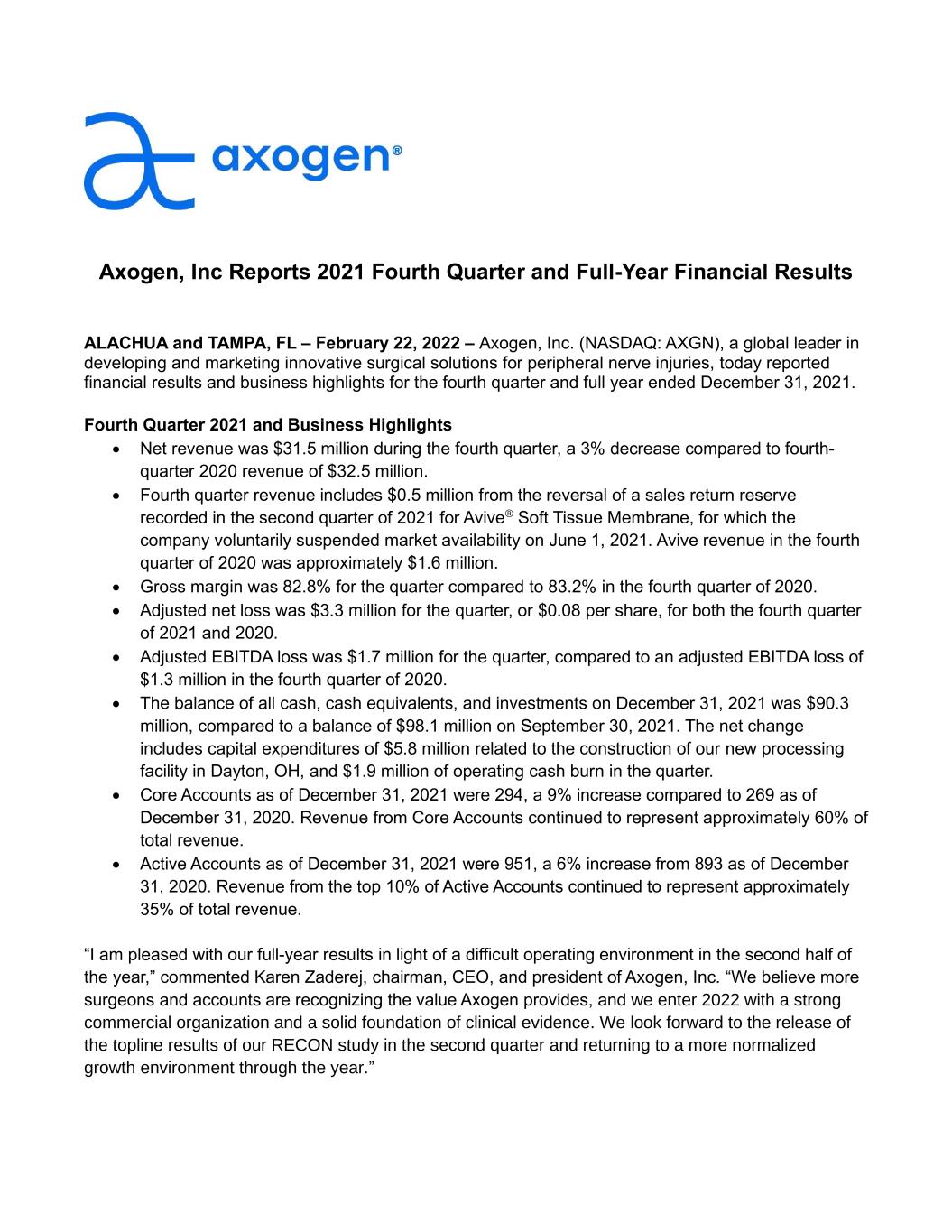 Axogen, Inc Reports 2021 Fourth Quarter and Full-Year Financial Results ALACHUA and TAMPA, FL – February 22, 2022 – Axogen, Inc. (NASDAQ: AXGN), a global leader in developing and marketing innovative surgical solutions for peripheral nerve injuries, today reported financial results and business highlights for the fourth quarter and full year ended December 31, 2021. Fourth Quarter 2021 and Business Highlights • Net revenue was $31.5 million during the fourth quarter, a 3% decrease compared to fourth- quarter 2020 revenue of $32.5 million. • Fourth quarter revenue includes $0.5 million from the reversal of a sales return reserve recorded in the second quarter of 2021 for Avive® Soft Tissue Membrane, for which the company voluntarily suspended market availability on June 1, 2021. Avive revenue in the fourth quarter of 2020 was approximately $1.6 million. • Gross margin was 82.8% for the quarter compared to 83.2% in the fourth quarter of 2020. • Adjusted net loss was $3.3 million for the quarter, or $0.08 per share, for both the fourth quarter of 2021 and 2020. • Adjusted EBITDA loss was $1.7 million for the quarter, compared to an adjusted EBITDA loss of $1.3 million in the fourth quarter of 2020. • The balance of all cash, cash equivalents, and investments on December 31, 2021 was $90.3 million, compared to a balance of $98.1 million on September 30, 2021. The net change includes capital expenditures of $5.8 million related to the construction of our new processing facility in Dayton, OH, and $1.9 million of operating cash burn in the quarter. • Core Accounts as of December 31, 2021 were 294, a 9% increase compared to 269 as of December 31, 2020. Revenue from Core Accounts continued to represent approximately 60% of total revenue. • Active Accounts as of December 31, 2021 were 951, a 6% increase from 893 as of December 31, 2020. Revenue from the top 10% of Active Accounts continued to represent approximately 35% of total revenue. “I am pleased with our full-year results in light of a difficult operating environment in the second half of the year,” commented Karen Zaderej, chairman, CEO, and president of Axogen, Inc. “We believe more surgeons and accounts are recognizing the value Axogen provides, and we enter 2022 with a strong commercial organization and a solid foundation of clinical evidence. We look forward to the release of the topline results of our RECON study in the second quarter and returning to a more normalized growth environment through the year.”