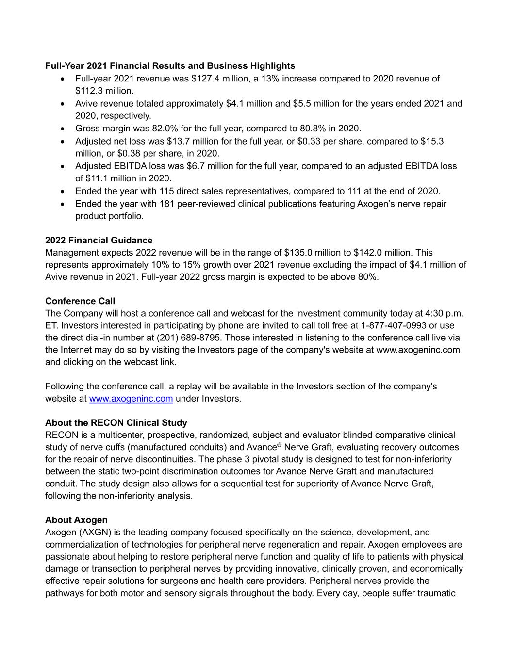 Full-Year 2021 Financial Results and Business Highlights • Full-year 2021 revenue was $127.4 million, a 13% increase compared to 2020 revenue of $112.3 million. • Avive revenue totaled approximately $4.1 million and $5.5 million for the years ended 2021 and 2020, respectively. • Gross margin was 82.0% for the full year, compared to 80.8% in 2020. • Adjusted net loss was $13.7 million for the full year, or $0.33 per share, compared to $15.3 million, or $0.38 per share, in 2020. • Adjusted EBITDA loss was $6.7 million for the full year, compared to an adjusted EBITDA loss of $11.1 million in 2020. • Ended the year with 115 direct sales representatives, compared to 111 at the end of 2020. • Ended the year with 181 peer-reviewed clinical publications featuring Axogen’s nerve repair product portfolio. 2022 Financial Guidance Management expects 2022 revenue will be in the range of $135.0 million to $142.0 million. This represents approximately 10% to 15% growth over 2021 revenue excluding the impact of $4.1 million of Avive revenue in 2021. Full-year 2022 gross margin is expected to be above 80%. Conference Call The Company will host a conference call and webcast for the investment community today at 4:30 p.m. ET. Investors interested in participating by phone are invited to call toll free at 1-877-407-0993 or use the direct dial-in number at (201) 689-8795. Those interested in listening to the conference call live via the Internet may do so by visiting the Investors page of the company's website at www.axogeninc.com and clicking on the webcast link. Following the conference call, a replay will be available in the Investors section of the company's website at www.axogeninc.com under Investors. About the RECON Clinical Study RECON is a multicenter, prospective, randomized, subject and evaluator blinded comparative clinical study of nerve cuffs (manufactured conduits) and Avance® Nerve Graft, evaluating recovery outcomes for the repair of nerve discontinuities. The phase 3 pivotal study is designed to test for non-inferiority between the static two-point discrimination outcomes for Avance Nerve Graft and manufactured conduit. The study design also allows for a sequential test for superiority of Avance Nerve Graft, following the non-inferiority analysis. About Axogen Axogen (AXGN) is the leading company focused specifically on the science, development, and commercialization of technologies for peripheral nerve regeneration and repair. Axogen employees are passionate about helping to restore peripheral nerve function and quality of life to patients with physical damage or transection to peripheral nerves by providing innovative, clinically proven, and economically effective repair solutions for surgeons and health care providers. Peripheral nerves provide the pathways for both motor and sensory signals throughout the body. Every day, people suffer traumatic