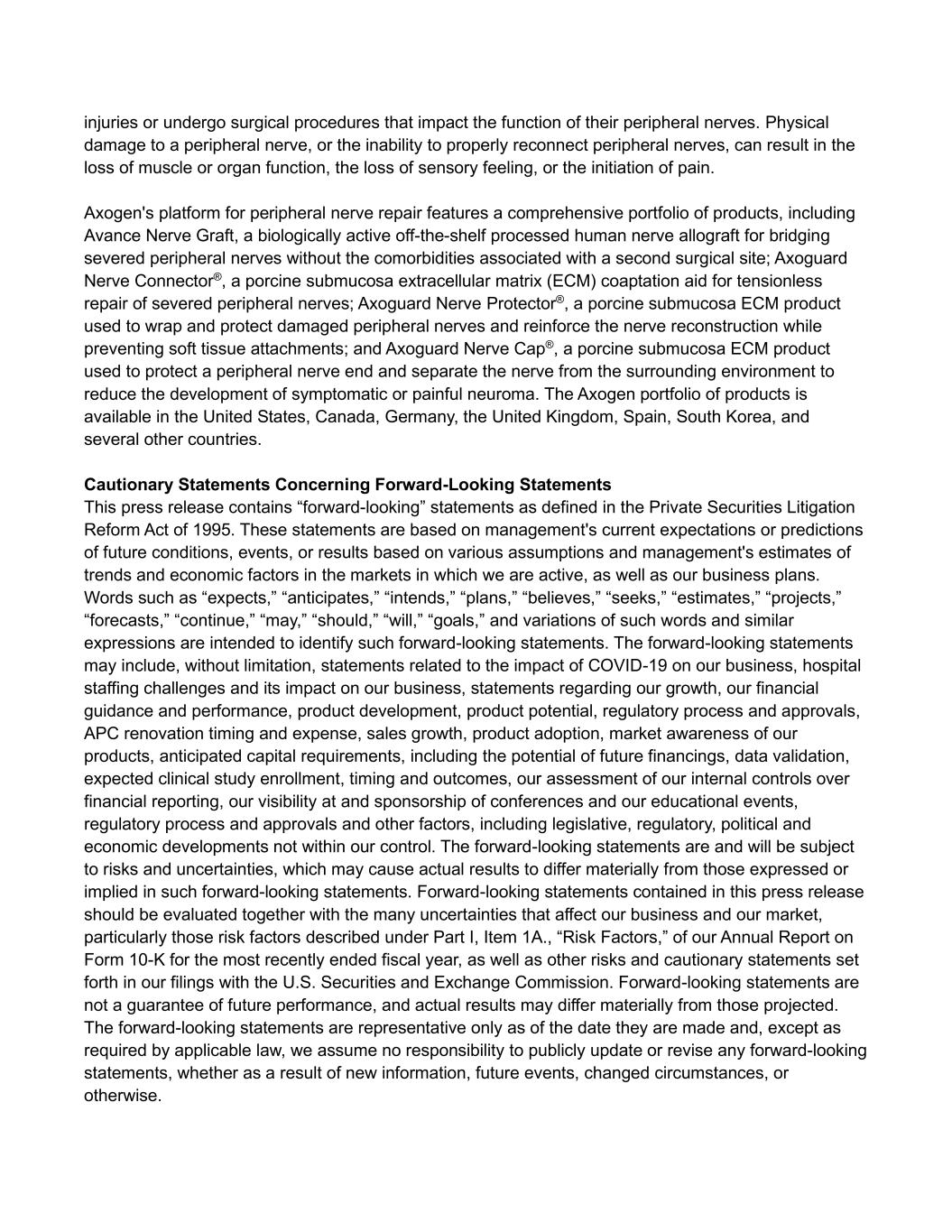 injuries or undergo surgical procedures that impact the function of their peripheral nerves. Physical damage to a peripheral nerve, or the inability to properly reconnect peripheral nerves, can result in the loss of muscle or organ function, the loss of sensory feeling, or the initiation of pain. Axogen's platform for peripheral nerve repair features a comprehensive portfolio of products, including Avance Nerve Graft, a biologically active off-the-shelf processed human nerve allograft for bridging severed peripheral nerves without the comorbidities associated with a second surgical site; Axoguard Nerve Connector®, a porcine submucosa extracellular matrix (ECM) coaptation aid for tensionless repair of severed peripheral nerves; Axoguard Nerve Protector®, a porcine submucosa ECM product used to wrap and protect damaged peripheral nerves and reinforce the nerve reconstruction while preventing soft tissue attachments; and Axoguard Nerve Cap®, a porcine submucosa ECM product used to protect a peripheral nerve end and separate the nerve from the surrounding environment to reduce the development of symptomatic or painful neuroma. The Axogen portfolio of products is available in the United States, Canada, Germany, the United Kingdom, Spain, South Korea, and several other countries. Cautionary Statements Concerning Forward-Looking Statements This press release contains “forward-looking” statements as defined in the Private Securities Litigation Reform Act of 1995. These statements are based on management's current expectations or predictions of future conditions, events, or results based on various assumptions and management's estimates of trends and economic factors in the markets in which we are active, as well as our business plans. Words such as “expects,” “anticipates,” “intends,” “plans,” “believes,” “seeks,” “estimates,” “projects,” “forecasts,” “continue,” “may,” “should,” “will,” “goals,” and variations of such words and similar expressions are intended to identify such forward-looking statements. The forward-looking statements may include, without limitation, statements related to the impact of COVID-19 on our business, hospital staffing challenges and its impact on our business, statements regarding our growth, our financial guidance and performance, product development, product potential, regulatory process and approvals, APC renovation timing and expense, sales growth, product adoption, market awareness of our products, anticipated capital requirements, including the potential of future financings, data validation, expected clinical study enrollment, timing and outcomes, our assessment of our internal controls over financial reporting, our visibility at and sponsorship of conferences and our educational events, regulatory process and approvals and other factors, including legislative, regulatory, political and economic developments not within our control. The forward-looking statements are and will be subject to risks and uncertainties, which may cause actual results to differ materially from those expressed or implied in such forward-looking statements. Forward-looking statements contained in this press release should be evaluated together with the many uncertainties that affect our business and our market, particularly those risk factors described under Part I, Item 1A., “Risk Factors,” of our Annual Report on Form 10-K for the most recently ended fiscal year, as well as other risks and cautionary statements set forth in our filings with the U.S. Securities and Exchange Commission. Forward-looking statements are not a guarantee of future performance, and actual results may differ materially from those projected. The forward-looking statements are representative only as of the date they are made and, except as required by applicable law, we assume no responsibility to publicly update or revise any forward-looking statements, whether as a result of new information, future events, changed circumstances, or otherwise.
