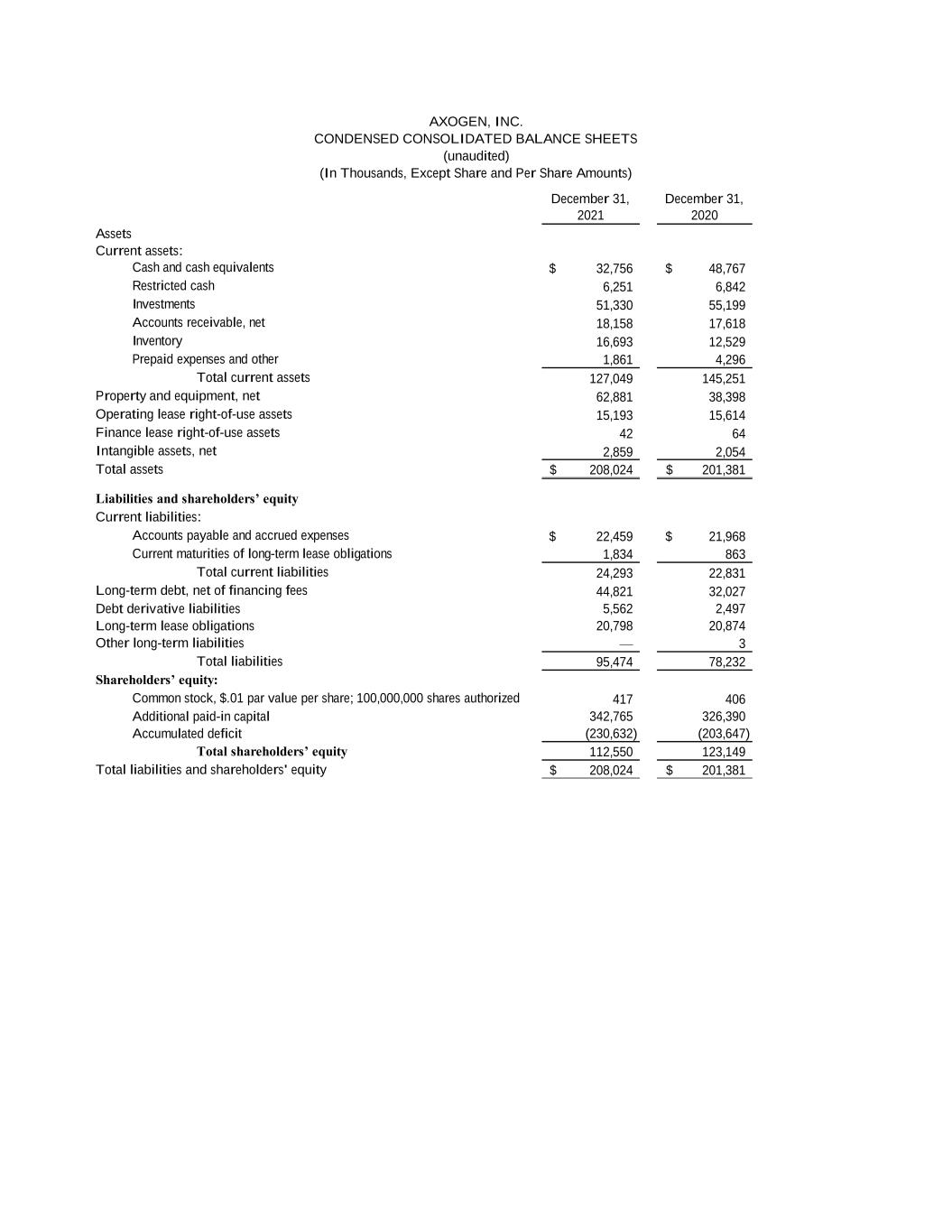 December 31, December 31, 2021 2020 Assets Current assets: Cash and cash equivalents 32,756$ 48,767$ Restricted cash 6,251 6,842 Investments 51,330 55,199 Accounts receivable, net 18,158 17,618 Inventory 16,693 12,529 Prepaid expenses and other 1,861 4,296 Total current assets 127,049 145,251 Property and equipment, net 62,881 38,398 Operating lease right-of-use assets 15,193 15,614 Finance lease right-of-use assets 42 64 Intangible assets, net 2,859 2,054 Total assets 208,024$ 201,381$ Liabilities and shareholders’ equity Current liabilities: Accounts payable and accrued expenses 22,459$ 21,968$ Current maturities of long-term lease obligations 1,834 863 Total current liabilities 24,293 22,831 Long-term debt, net of financing fees 44,821 32,027 Debt derivative liabilities 5,562 2,497 Long-term lease obligations 20,798 20,874 Other long-term liabilities — 3 Total liabilities 95,474 78,232 Shareholders’ equity: Common stock, $.01 par value per share; 100,000,000 shares authorized 417 406 Additional paid-in capital 342,765 326,390 Accumulated deficit (230,632) (203,647) Total shareholders’ equity 112,550 123,149 Total liabilities and shareholders' equity 208,024$ 201,381$ AXOGEN, INC. CONDENSED CONSOLIDATED BALANCE SHEETS (unaudited) (In Thousands, Except Share and Per Share Amounts)