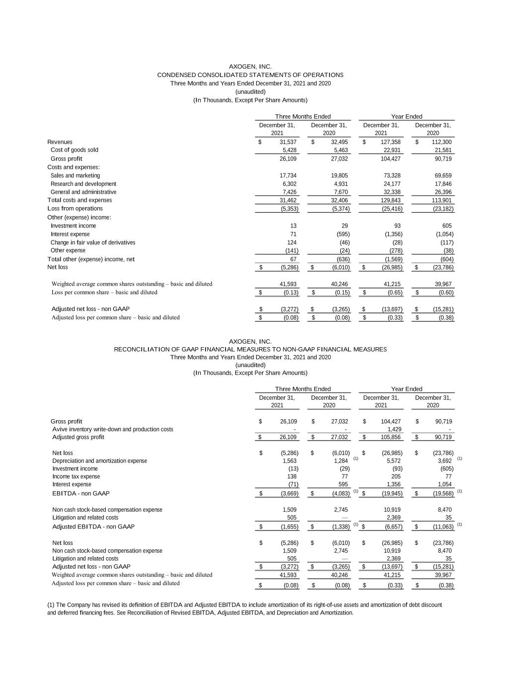 December 31, December 31, December 31, December 31, 2021 2020 2021 2020 Revenues 31,537$ 32,495$ 127,358$ 112,300$ Cost of goods sold 5,428 5,463 22,931 21,581 Gross profit 26,109 27,032 104,427 90,719 Costs and expenses: Sales and marketing 17,734 19,805 73,328 69,659 Research and development 6,302 4,931 24,177 17,846 General and administrative 7,426 7,670 32,338 26,396 Total costs and expenses 31,462 32,406 129,843 113,901 Loss from operations (5,353) (5,374) (25,416) (23,182) Other (expense) income: Investment income 13 29 93 605 Interest expense 71 (595) (1,356) (1,054) Change in fair value of derivatives 124 (46) (28) (117) Other expense (141) (24) (278) (38) Total other (expense) income, net 67 (636) (1,569) (604) Net loss (5,286)$ (6,010)$ (26,985)$ (23,786)$ Weighted average common shares outstanding – basic and diluted 41,593 40,246 41,215 39,967 Loss per common share – basic and diluted (0.13)$ (0.15)$ (0.65)$ (0.60)$ Adjusted net loss - non GAAP (3,272)$ (3,265)$ (13,697)$ (15,281)$ Adjusted loss per common share – basic and diluted (0.08)$ (0.08)$ (0.33)$ (0.38)$ December 31, December 31, December 31, December 31, 2021 2020 2021 2020 Gross profit $ 26,109 $ 27,032 $ 104,427 $ 90,719 Avive inventory write-down and production costs - - 1,429 - Adjusted gross profit 26,109$ 27,032$ 105,856$ 90,719$ Net loss (5,286)$ (6,010)$ (26,985)$ (23,786)$ Depreciation and amortization expense 1,563 1,284 (1) 5,572 3,692 (1) Investment income (13) (29) (93) (605) Income tax expense 138 77 205 77 Interest expense (71) 595 1,356 1,054 EBITDA - non GAAP (3,669)$ (4,083)$ (1) (19,945)$ (19,568)$ (1) Non cash stock-based compensation expense 1,509 2,745 10,919 8,470 Litigation and related costs 505 — 2,369 35 Adjusted EBITDA - non GAAP (1,655)$ (1,338)$ (1) (6,657)$ (11,063)$ (1) Net loss (5,286)$ (6,010)$ (26,985)$ (23,786)$ Non cash stock-based compensation expense 1,509 2,745 10,919 8,470 Litigation and related costs 505 — 2,369 35 Adjusted net loss - non GAAP (3,272)$ (3,265)$ (13,697)$ (15,281)$ Weighted average common shares outstanding – basic and diluted 41,593 40,246 41,215 39,967 Adjusted loss per common share – basic and diluted (0.08)$ (0.08)$ (0.33)$ (0.38)$ (1) The Company has revised its definition of EBITDA and Adjusted EBITDA to include amortization of its right-of-use assets and amortization of debt discount and deferred financing fees. See Reconciliation of Revised EBITDA, Adjusted EBITDA, and Depreciation and Amortization. RECONCILIATION OF GAAP FINANCIAL MEASURES TO NON-GAAP FINANCIAL MEASURES CONDENSED CONSOLIDATED STATEMENTS OF OPERATIONS Three Months and Years Ended December 31, 2021 and 2020 (unaudited) Three Months Ended Year Ended AXOGEN, INC. (In Thousands, Except Per Share Amounts) (In Thousands, Except Per Share Amounts) AXOGEN, INC. Three Months and Years Ended December 31, 2021 and 2020 (unaudited) Three Months Ended Year Ended