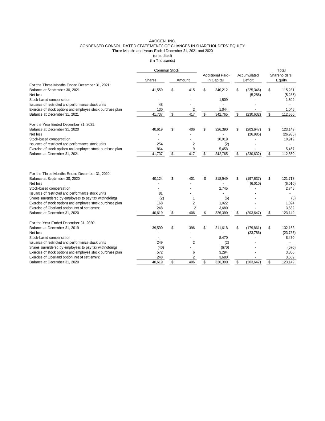 Total Shares Amount Accumulated Deficit Shareholders' Equity For the Three Months Ended December 31, 2021: Balance at September 30, 2021 41,559 415$ 340,212$ (225,346)$ 115,281$ Net loss - - - (5,286) (5,286) Stock-based compensation - - 1,509 - 1,509 Issuance of restricted and performance stock units 48 - - - - Exercise of stock options and employee stock purchase plan 130 2 1,044 - 1,046 Balance at December 31, 2021 41,737 417$ 342,765$ (230,632)$ 112,550$ For the Year Ended December 31, 2021: Balance at December 31, 2020 40,619 406$ 326,390$ (203,647)$ 123,149$ Net loss - - - (26,985) (26,985) Stock-based compensation - - 10,919 - 10,919 Issuance of restricted and performance stock units 254 2 (2) - - Exercise of stock options and employee stock purchase plan 864 9 5,458 - 5,467 Balance at December 31, 2021 41,737 417$ 342,765$ (230,632)$ 112,550$ For the Three Months Ended December 31, 2020: Balance at September 30, 2020 40,124 401$ 318,949$ (197,637)$ 121,713$ Net loss - - - (6,010) (6,010) Stock-based compensation - - 2,745 - 2,745 Issuance of restricted and performance stock units 81 - - - - Shares surrendered by employees to pay tax withholdings (2) 1 (6) - (5) Exercise of stock options and employee stock purchase plan 168 2 1,022 - 1,024 Exercise of Oberland option, net of settlement 248 2 3,680 - 3,682 Balance at December 31, 2020 40,619 406$ 326,390$ (203,647)$ 123,149$ For the Year Ended December 31, 2020: Balance at December 31, 2019 39,590 396$ 311,618$ (179,861)$ 132,153$ Net loss - - - (23,786) (23,786) Stock-based compensation - - 8,470 - 8,470 Issuance of restricted and performance stock units 249 2 (2) - - Shares surrendered by employees to pay tax withholdings (40) - (670) - (670) Exercise of stock options and employee stock purchase plan 572 6 3,294 - 3,300 Exercise of Oberland option, net of settlement 248 2 3,680 - 3,682 Balance at December 31, 2020 40,619 406$ 326,390$ (203,647)$ 123,149$ AXOGEN, INC. (In Thousands) (unaudited) Three Months and Years Ended December 31, 2021 and 2020 CONDENSED CONSOLIDATED STATEMENTS OF CHANGES IN SHAREHOLDERS' EQUITY Additional Paid- in Capital Common Stock