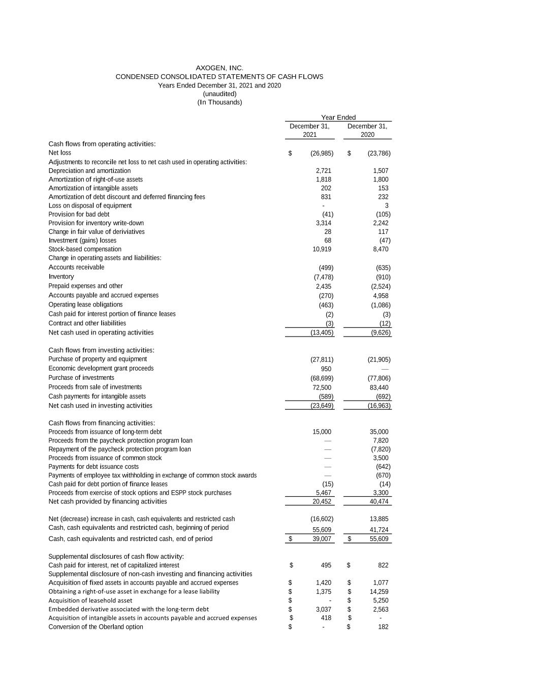December 31, December 31, 2021 2020 Cash flows from operating activities: Net loss (26,985)$ (23,786)$ Adjustments to reconcile net loss to net cash used in operating activities: Depreciation and amortization 2,721 1,507 Amortization of right-of-use assets 1,818 1,800 Amortization of intangible assets 202 153 Amortization of debt discount and deferred financing fees 831 232 Loss on disposal of equipment - 3 Provision for bad debt (41) (105) Provision for inventory write-down 3,314 2,242 Change in fair value of deriviatives 28 117 Investment (gains) losses 68 (47) Stock-based compensation 10,919 8,470 Change in operating assets and liabilities: Accounts receivable (499) (635) Inventory (7,478) (910) Prepaid expenses and other 2,435 (2,524) Accounts payable and accrued expenses (270) 4,958 Operating lease obligations (463) (1,086) Cash paid for interest portion of finance leases (2) (3) Contract and other liabilities (3) (12) Net cash used in operating activities (13,405) (9,626) Cash flows from investing activities: Purchase of property and equipment (27,811) (21,905) Economic development grant proceeds 950 — Purchase of investments (68,699) (77,806) Proceeds from sale of investments 72,500 83,440 Cash payments for intangible assets (589) (692) Net cash used in investing activities (23,649) (16,963) Cash flows from financing activities: Proceeds from issuance of long-term debt 15,000 35,000 Proceeds from the paycheck protection program loan — 7,820 Repayment of the paycheck protection program loan — (7,820) Proceeds from issuance of common stock — 3,500 Payments for debt issuance costs — (642) Payments of employee tax withholding in exchange of common stock awards — (670) Cash paid for debt portion of finance leases (15) (14) Proceeds from exercise of stock options and ESPP stock purchases 5,467 3,300 Net cash provided by financing activities 20,452 40,474 Net (decrease) increase in cash, cash equivalents and restricted cash (16,602) 13,885 Cash, cash equivalents and restricted cash, beginning of period 55,609 41,724 Cash, cash equivalents and restricted cash, end of period 39,007$ 55,609$ Supplemental disclosures of cash flow activity: Cash paid for interest, net of capitalized interest 495$ 822$ Supplemental disclosure of non-cash investing and financing activities Acquisition of fixed assets in accounts payable and accrued expenses 1,420$ 1,077$ Obtaining a right-of-use asset in exchange for a lease liability 1,375$ 14,259$ Acquisition of leasehold asset -$ 5,250$ Embedded derivative associated with the long-term debt 3,037$ 2,563$ Acquisition of intangible assets in accounts payable and accrued expenses 418$ -$ Conversion of the Oberland option -$ 182$ (unaudited) Years Ended December 31, 2021 and 2020 (In Thousands) Year Ended AXOGEN, INC. CONDENSED CONSOLIDATED STATEMENTS OF CASH FLOWS