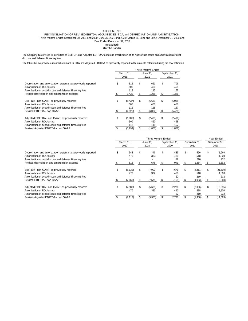 The Company has revised its definition of EBITDA and Adjusted EBITDA to include amortization of its right-of-use assets and amortization of debt discount and deferred financing fees. The tables below provide a reconciliation of EBITDA and Adjusted EBITDA as previously reported to the amounts calculated using the new definition. March 31, June 30, September 30, 2021 2021 2021 Depreciation and amortization expense, as previously reported 818$ 661$ 706$ Amortization of ROU assets 500 460 458 Amortization of debt discount and deferred financing fees 112 115 157 Revised depreciation and amortization expense 1,430$ 1,236$ 1,321$ EBITDA - non GAAP, as previously reported (5,437)$ (6,639)$ (6,035)$ Amortization of ROU assets 500 460 458 Amortization of debt discount and deferred financing fees 112 115 157 Revised EBITDA - non GAAP (4,825)$ (6,064)$ (5,420)$ Adjusted EBITDA - non GAAP, as previously reported (1,906)$ (2,435)$ (2,496)$ Amortization of ROU assets 500 460 458 Amortization of debt discount and deferred financing fees 112 115 157 Revised Adjusted EBITDA - non GAAP (1,294)$ (1,860)$ (1,881)$ Year Ended March 31, June 30, September 30, December 31, December 31, 2020 2020 2020 2020 2020 Depreciation and amortization expense, as previously reported 343$ 346$ 439$ 556$ 1,660$ Amortization of ROU assets 470 332 480 518 1,800 Amortization of debt discount and deferred financing fees - - 22 210 232 Revised depreciation and amortization expense 813$ 678$ 941$ 1,284$ 3,692$ EBITDA - non GAAP, as previously reported (8,139)$ (7,907)$ (671)$ (4,811)$ (21,600)$ Amortization of ROU assets 470 332 480 518 1,800 Amortization of debt discount and deferred financing fees - - 22 210 232 Revised EBITDA - non GAAP (7,669)$ (7,575)$ (169)$ (4,083)$ (19,568)$ Adjusted EBITDA - non GAAP, as previously reported (7,583)$ (5,685)$ 2,276$ (2,066)$ (13,095)$ Amortization of ROU assets 470 332 480 518 1,800 Amortization of debt discount and deferred financing fees - - 22 210 232 Revised Adjusted EBITDA - non GAAP (7,113)$ (5,353)$ 2,778$ (1,338)$ (11,063)$ Three Months Ended Year Ended December 31, 2020 (unaudited) (In Thousands) Three Months Ended AXOGEN, INC. RECONCILIATION OF REVISED EBITDA, ADJUSTED EBITDA, and DEPRECIATION AND AMORTIZATION Three Months Ended September 30, 2021 and 2020; June 30, 2021 and 2020; March 31, 2021 and 2020; December 31, 2020 and