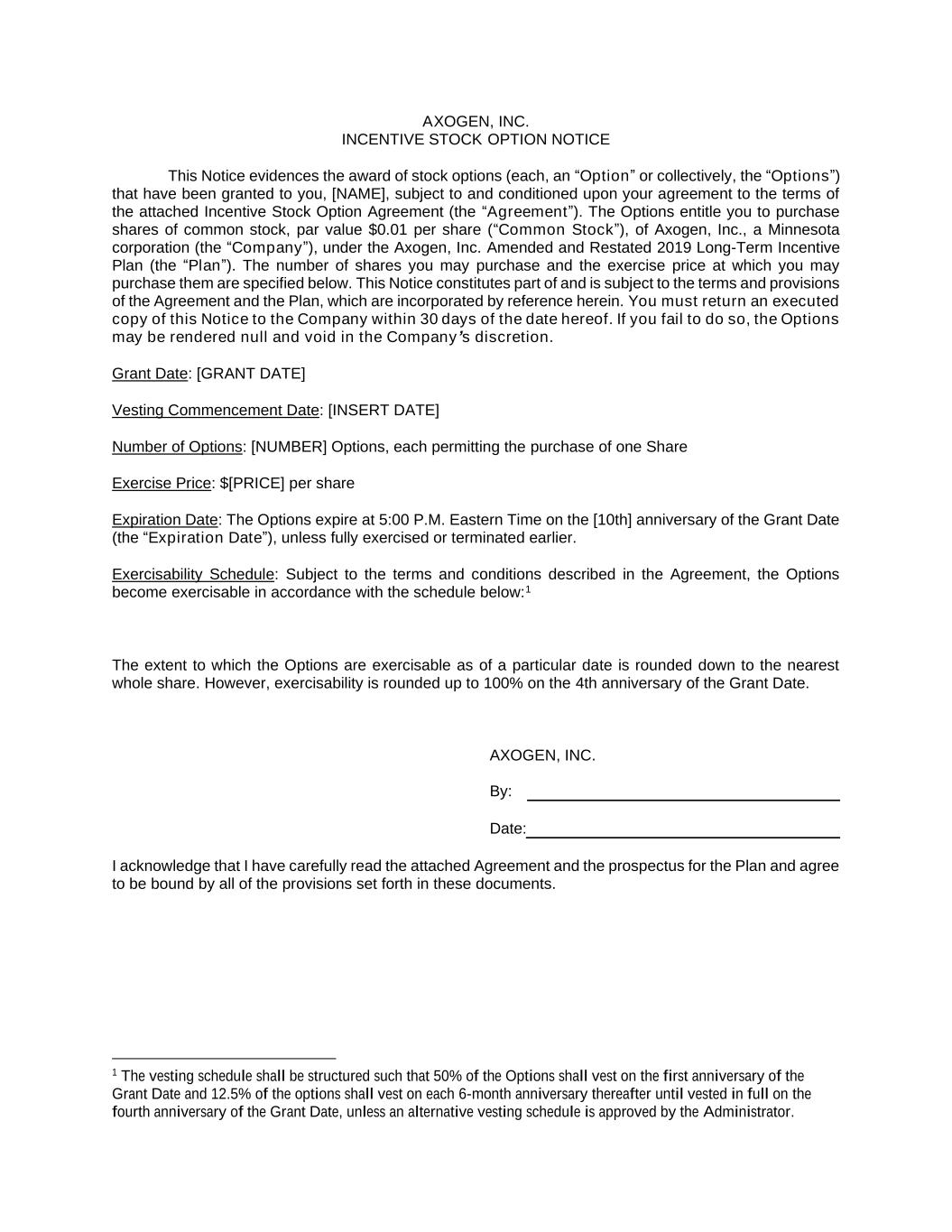 AXOGEN, INC. INCENTIVE STOCK OPTION NOTICE This Notice evidences the award of stock options (each, an “Option” or collectively, the “Options”) that have been granted to you, [NAME], subject to and conditioned upon your agreement to the terms of the attached Incentive Stock Option Agreement (the “Agreement”). The Options entitle you to purchase shares of common stock, par value $0.01 per share (“Common Stock”), of Axogen, Inc., a Minnesota corporation (the “Company”), under the Axogen, Inc. Amended and Restated 2019 Long-Term Incentive Plan (the “Plan”). The number of shares you may purchase and the exercise price at which you may purchase them are specified below. This Notice constitutes part of and is subject to the terms and provisions of the Agreement and the Plan, which are incorporated by reference herein. You must return an executed copy of this Notice to the Company within 30 days of the date hereof. If you fail to do so, the Options may be rendered null and void in the Company’s discretion. Grant Date: [GRANT DATE] Vesting Commencement Date: [INSERT DATE] Number of Options: [NUMBER] Options, each permitting the purchase of one Share Exercise Price: $[PRICE] per share Expiration Date: The Options expire at 5:00 P.M. Eastern Time on the [10th] anniversary of the Grant Date (the “Expiration Date”), unless fully exercised or terminated earlier. Exercisability Schedule: Subject to the terms and conditions described in the Agreement, the Options become exercisable in accordance with the schedule below:1 The extent to which the Options are exercisable as of a particular date is rounded down to the nearest whole share. However, exercisability is rounded up to 100% on the 4th anniversary of the Grant Date. AXOGEN, INC. By: Date: I acknowledge that I have carefully read the attached Agreement and the prospectus for the Plan and agree to be bound by all of the provisions set forth in these documents. 1 The vesting schedule shall be structured such that 50% of the Options shall vest on the first anniversary of the Grant Date and 12.5% of the options shall vest on each 6-month anniversary thereafter until vested in full on the fourth anniversary of the Grant Date, unless an alternative vesting schedule is approved by the Administrator.