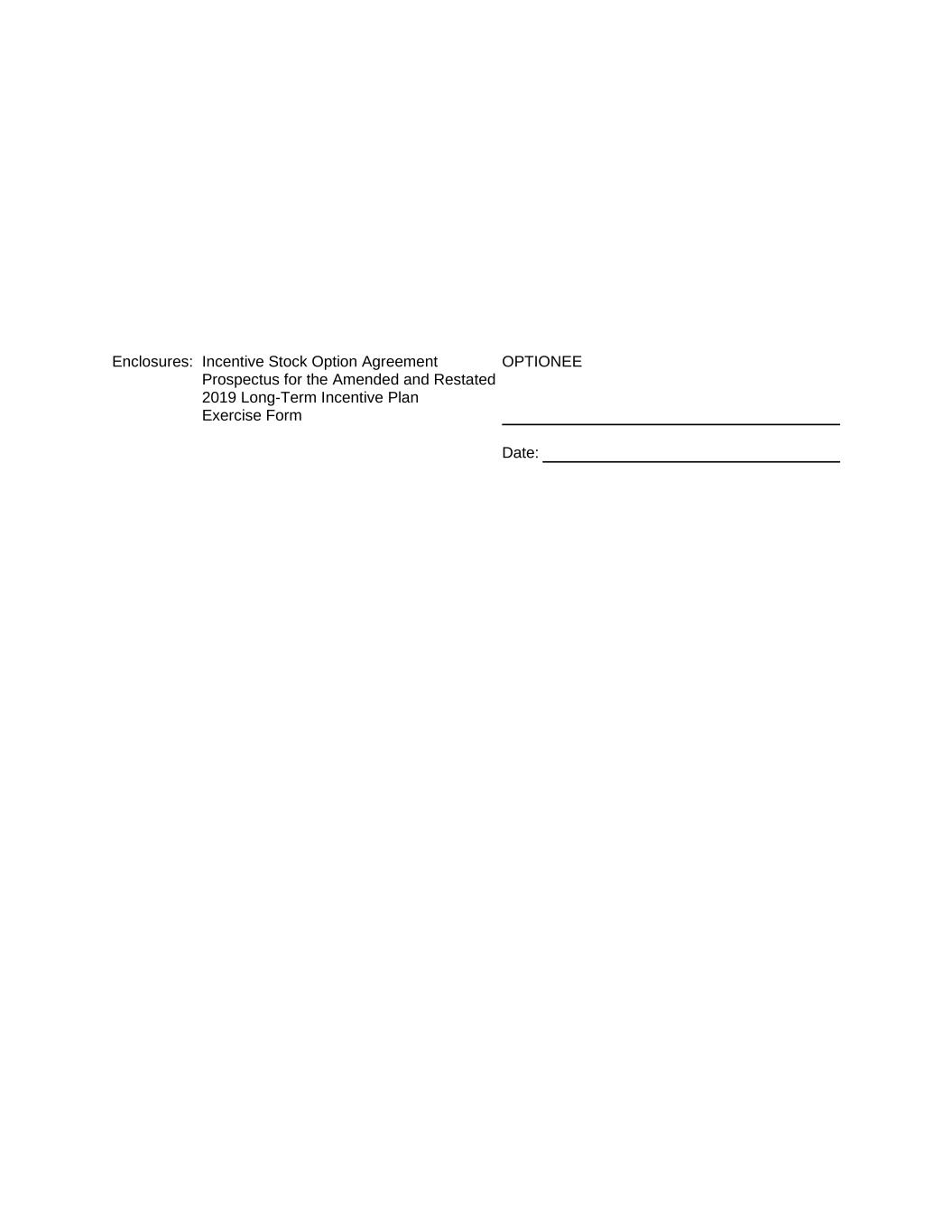 Enclosures: Incentive Stock Option Agreement Prospectus for the Amended and Restated 2019 Long-Term Incentive Plan Exercise Form OPTIONEE Date: